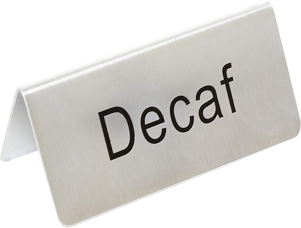 - لافتة خيمة الطاولة، "منزوعة الكافيين"، 3 بوصة طول × 1-1/2 بوصة ارتفاع، فولاذ مقاوم للصدأ (24 لكل حد أدنى للطلب)