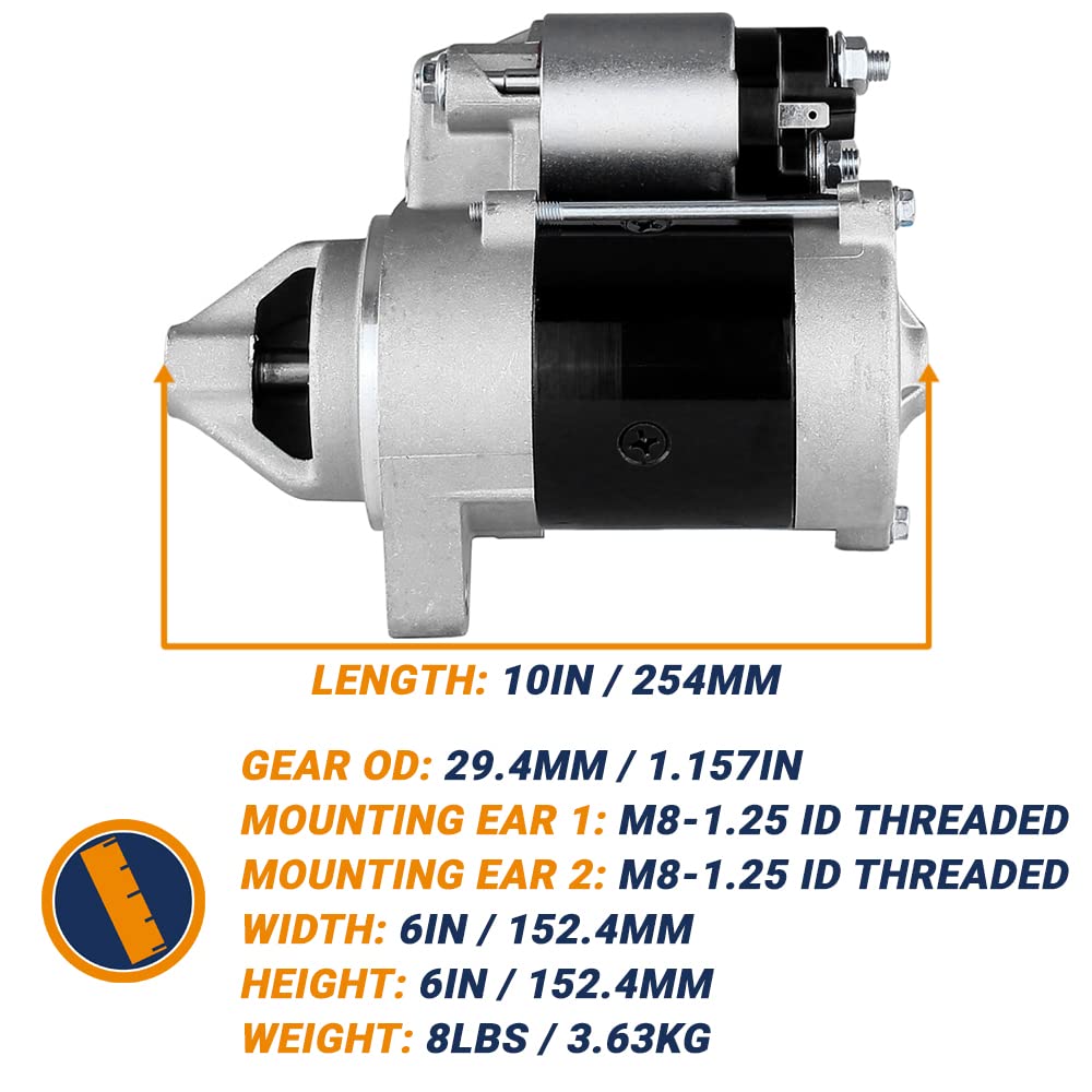 • SPECIFICATIONS: PRODUCT TYPE: STARTER STARTER TYPE: DD VOLTAGE: 12 ROTATION: COUNTER CLOCKWISE TOOTH COUNT: 9 GEAR OD: 29.4MM / 1.157IN MOUNTING EAR 1: M8-1.25 ID THREADED MOUNTING EAR 2: M8-1.25 ID THREADED WEIGHT: 7.14 LBS / 3.25 KG