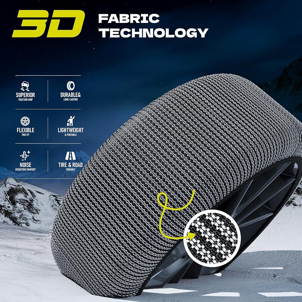 نسيج قوي ثلاثي الأبعاد لتحقيق أقصى قدر من الإمساك: مصنوع من نسيج معزز ثلاثي الأبعاد عالي القوة مصمم لتحقيق قوة جر فائقة على الثلج والجليد. يشكل النسيج المتين سطحًا ثابتًا ملامسًا للطريق، مما يوفر قبضة أفضل وتوجيهًا أفضل وفرامل أكثر أمانًا من السلاسل القديمة أو الكابلات الفولاذية.