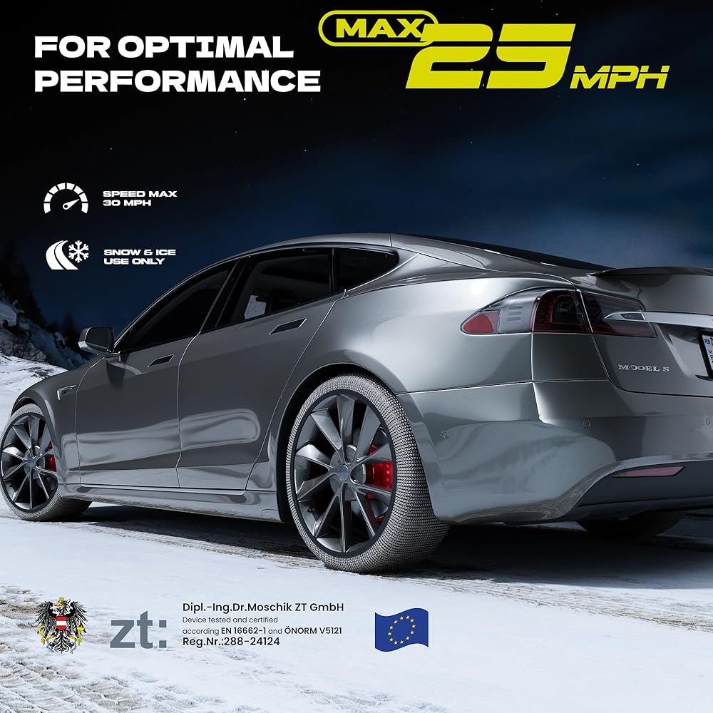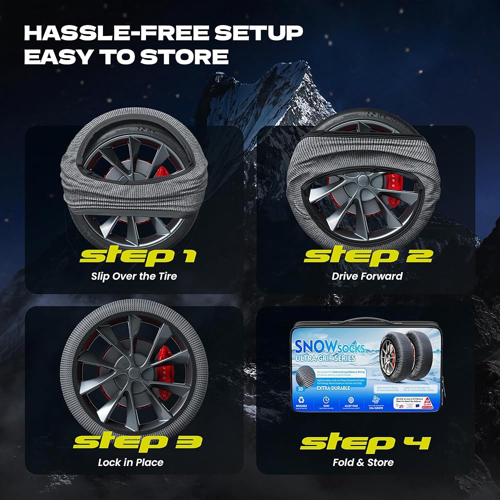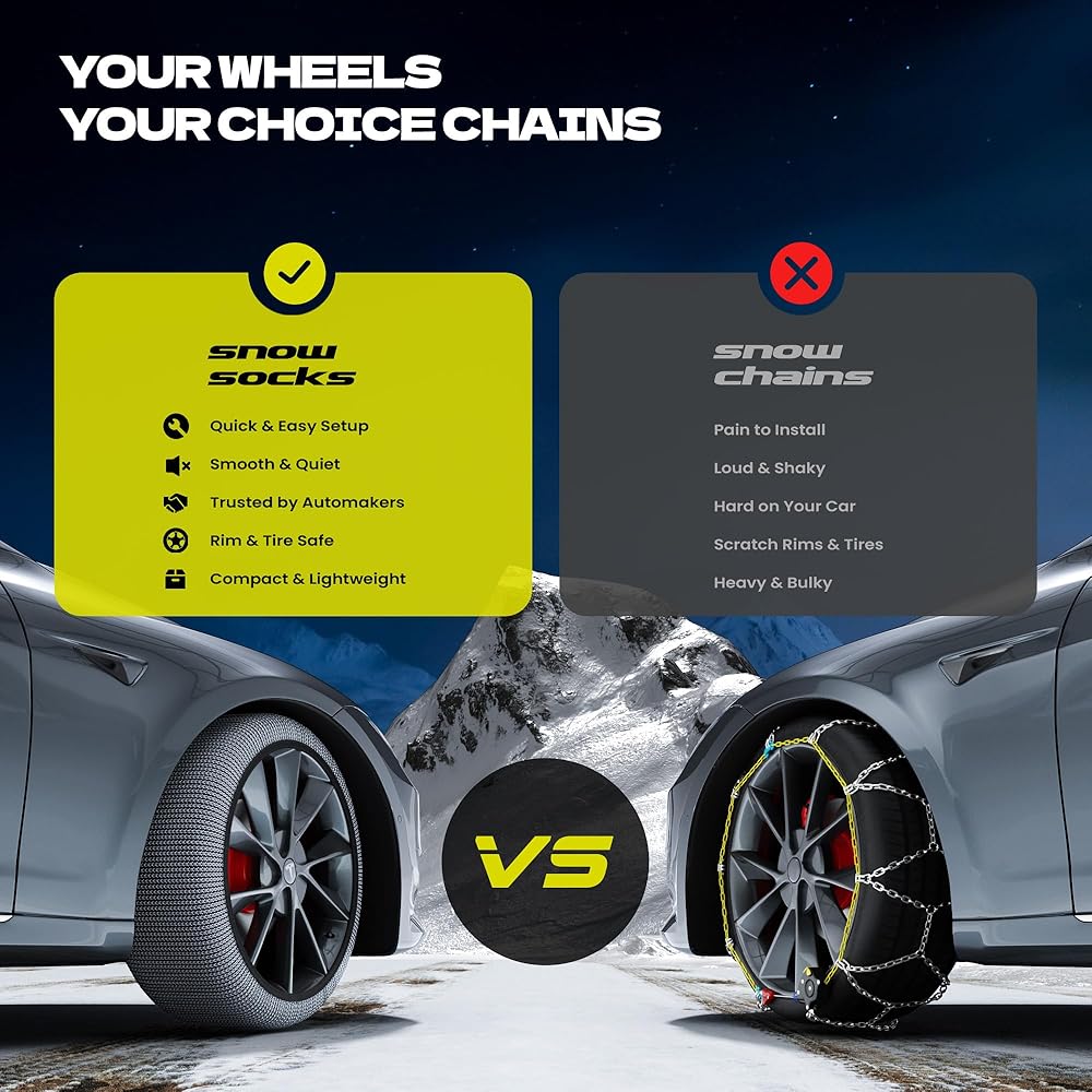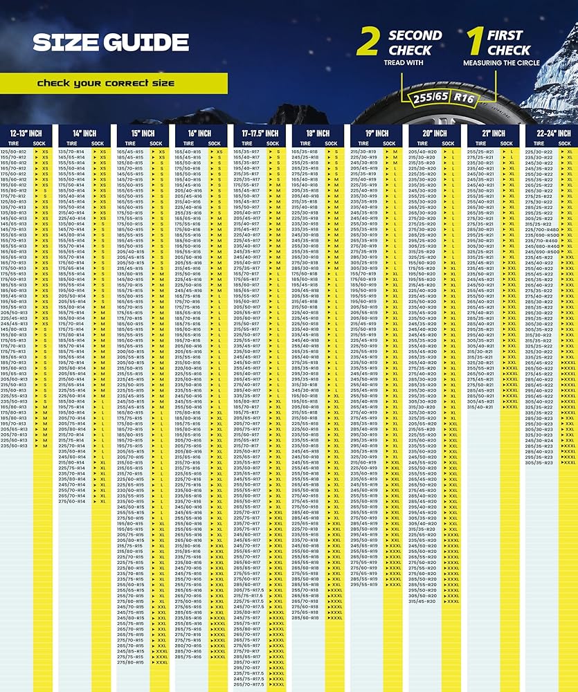 تناسب مجموعة واسعة من مقاسات الإطارات: متوفرة بمقاسات S وM وL وXL، هذه الجوارب الثلجية تناسب معظم سيارات الركاب وسيارات الدفع الرباعي والشاحنات الصغيرة والشاحنات الصغيرة. تحقق من جدول المقاسات التفصيلي الخاص بنا لضمان حصولك على المقاس المثالي لتحقيق أقصى قدر من الأداء والسلامة على الطرق الشتوية.