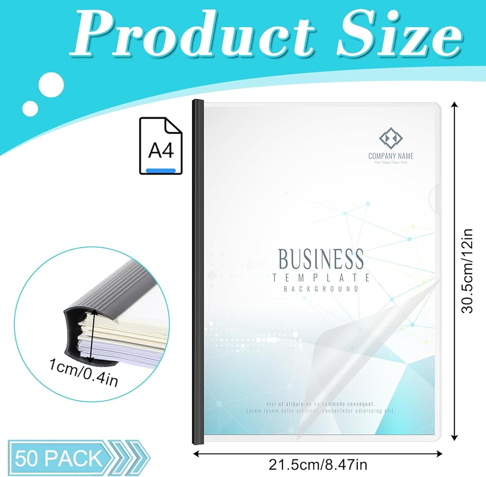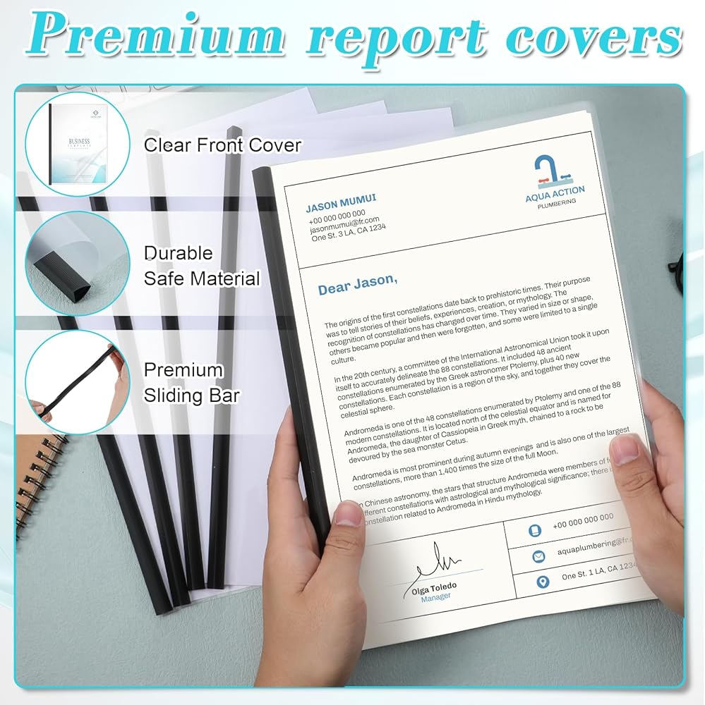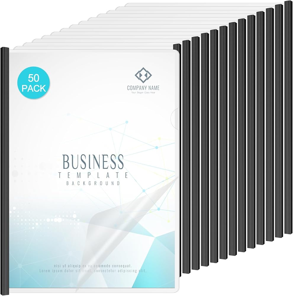 Complete 50-Piece Set for Letter-Size Documents: This professional set includes 50 crystal-clear report covers (8.5" x 12") and 50 sturdy black sliding bars - perfect for organizing and protecting standard 8.5" x 11" documents. The generous quantity ensures you'll have enough covers for multiple projects, presentations, or classroom needs.