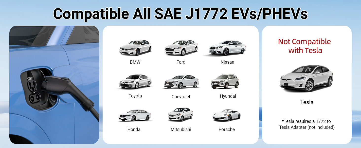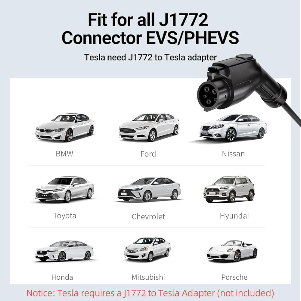 ✅[توافق واسع] تم تصميم شاحن EV الاحتياطي المحمول باستخدام موصل J1772 القياسي، وهو متوافق عالميًا مع جميع EVs والهجينة التي تستخدم موصل قابس J1772 القياسي. ملاحظة: بالنسبة لمركبات تيسلا، تحتاج إلى محول J1772 إلى تيسلا (غير متضمن).