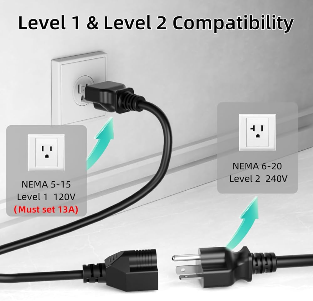 ✅【الشحن في أي مكان وفي أي وقت】مصمم لتحقيق أقصى قدر من المرونة، يتميز شاحن eTimxon Level 1 & 2 EV بالتوافق مع قابس NEMA 5-15 و6-20. سواء كنت تقوم بالشحن في المرآب الخاص بك، أو في منزل أحد الأصدقاء، أو في فندق على جانب الطريق. قابس NEMA 6-20 لشحن المستوى 2 ev (240 فولت، 16 أمبير، 3.84 كيلو وات) ومحول NEMA 5-15 لشحن المستوى 1 ev (120 فولت، 13 أمبير، 1.44 كيلو وات) ملاحظة: وفقًا لمعايير السلامة الكهربائية في أمريكا الشمالية، عند استخدام قابس NEMA 5-15، تحتاج إلى ضبط التيار إلى 13 أمبير يدويًا لحماية كل من سيارتك وسيارتك النظام الكهربائي في المنزل