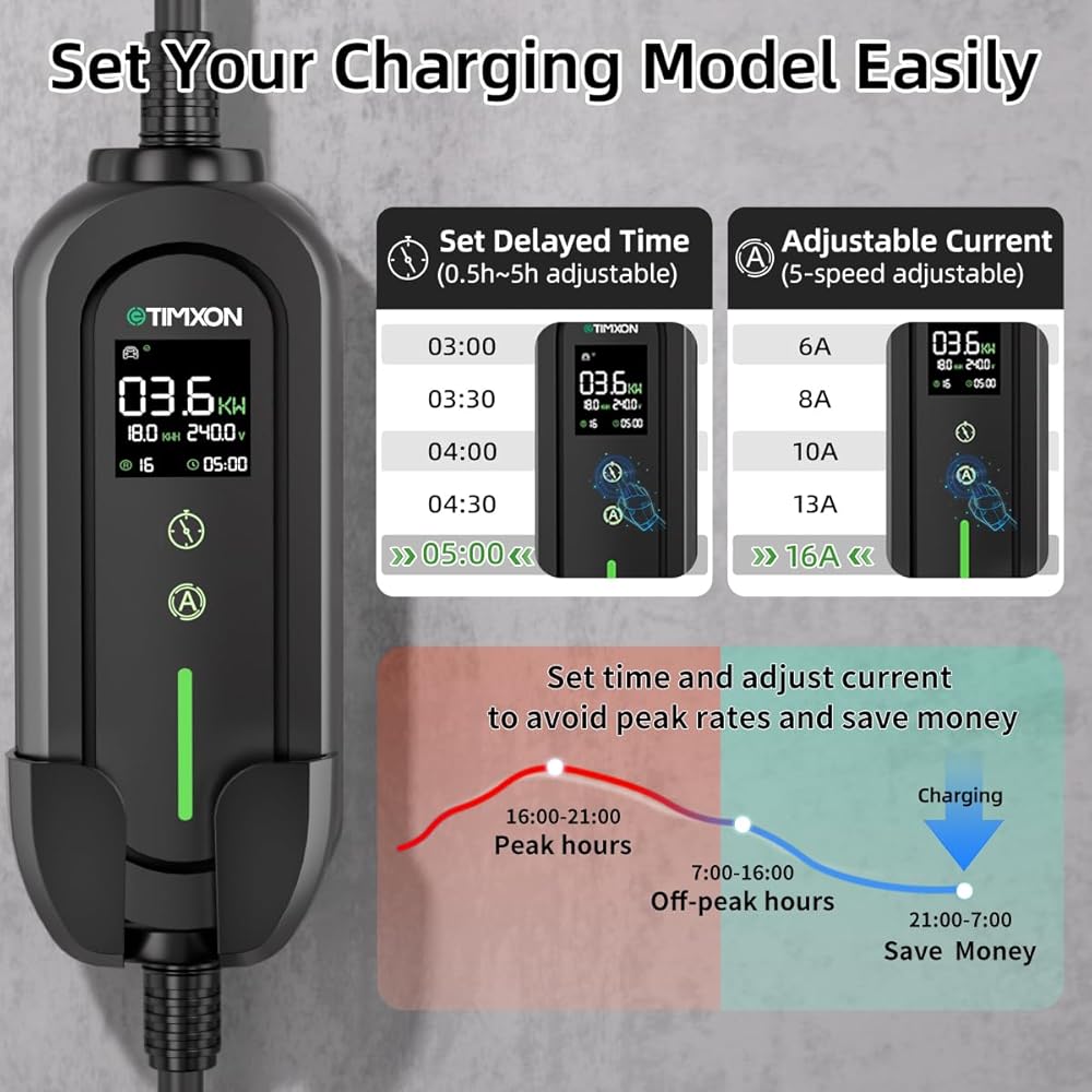 ✅[تيار قابل للتعديل وتأخير الشحن] يتميز شاحن J1772 EV هذا بتيار قابل للتعديل بأربعة مستويات (6A/8A/10A/13A/16A) ومؤقت تأخير ذكي لمدة 0.5-5 ساعات. سواء كنت تقوم بالشحن طوال الليل أو خارج ساعات الذروة، استمتع باستخدام أكثر ذكاءً للطاقة وتكاليف أقل وراحة تامة - مما يسمح لك بتحسين سرعة الشحن بناءً على احتياجاتك