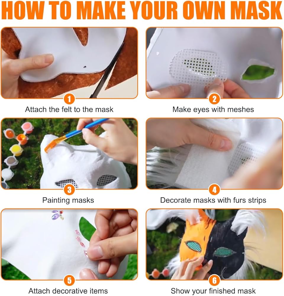 اصنع أسلوبك الخاص بسهولة: 6 قواعد قناع قطط فارغة، خفيفة الوزن. ألوان متعددة من قماش اللباد، مادة ناعمة، سهلة القطع واللون والشكل، لتغطية سطح القناع. يمكنك إضافة المزيد من المواد لإنشاء أشكال حيوانات مختلفة. حتى المبتدئين يمكنهم بسهولة إنشاء أي نمط تريده