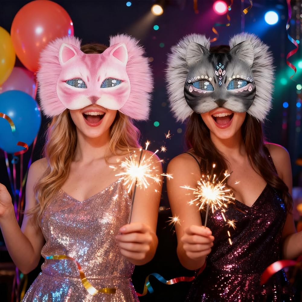 مواد ناعمة وارتداء مريح: لباد صديق للبشرة وفراء صناعي واقعي يوفر لمسة ناعمة. تضمن الشبكة المسامية رؤية واضحة وراحة، كما يوفر الحزام المرن القابل للتعديل ملاءمة آمنة للارتداء لفترة طويلة أثناء المناسبات