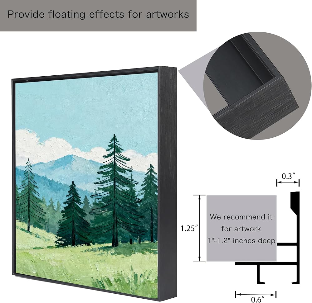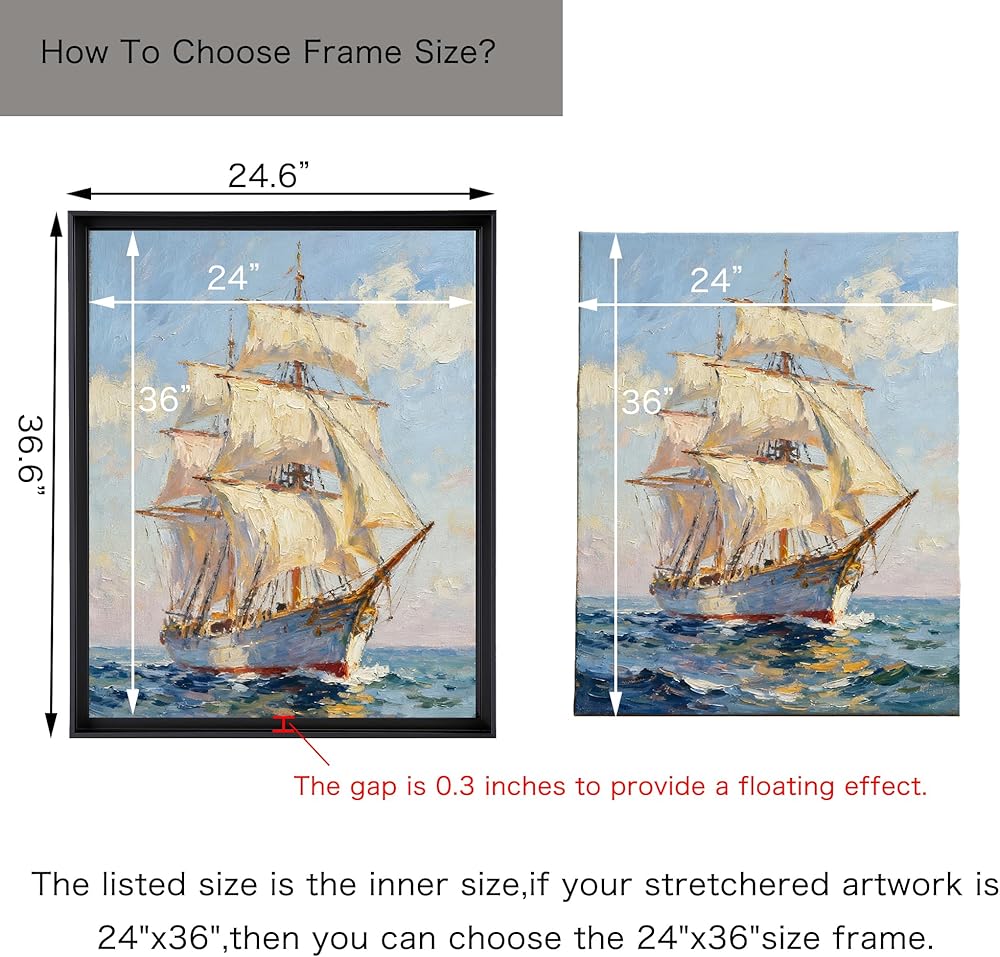 تحقق من المقاس: عمق الإطار العائم القماشي هو 1.25 بوصة، وسوف يناسب اللوحات الفنية القماشية بعمق 1-1.25 بوصة، والحجم المدرج هو الحجم الداخلي، لذا فإن مقاس اللوحة الفنية القماشية الخاصة بك هو 24x36 بوصة، فقط اختر إطار مقاس 24x36 بوصة.
