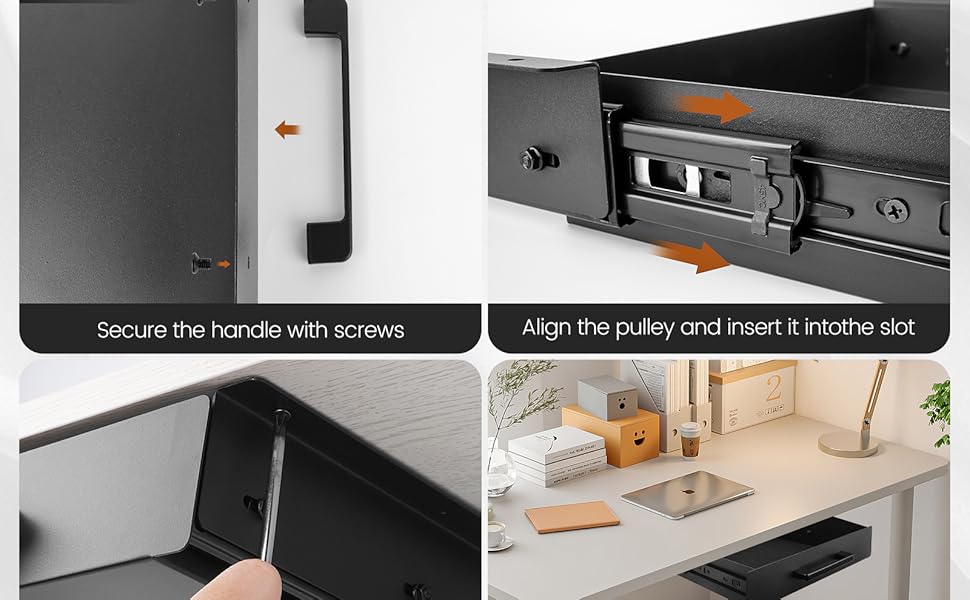 • الحد الأدنى من التجميع لأدراج المكتب: يتم تضمين الأجهزة والتعليمات للتجميع السريع والسهل. ما عليك سوى ربط دعامات الدعم بدرج المكتب، وستكون جاهزة للتركيب تحت مكتبك. هذا الإعداد الخالي من المتاعب يجعله إضافة ملائمة لأي مساحة عمل.