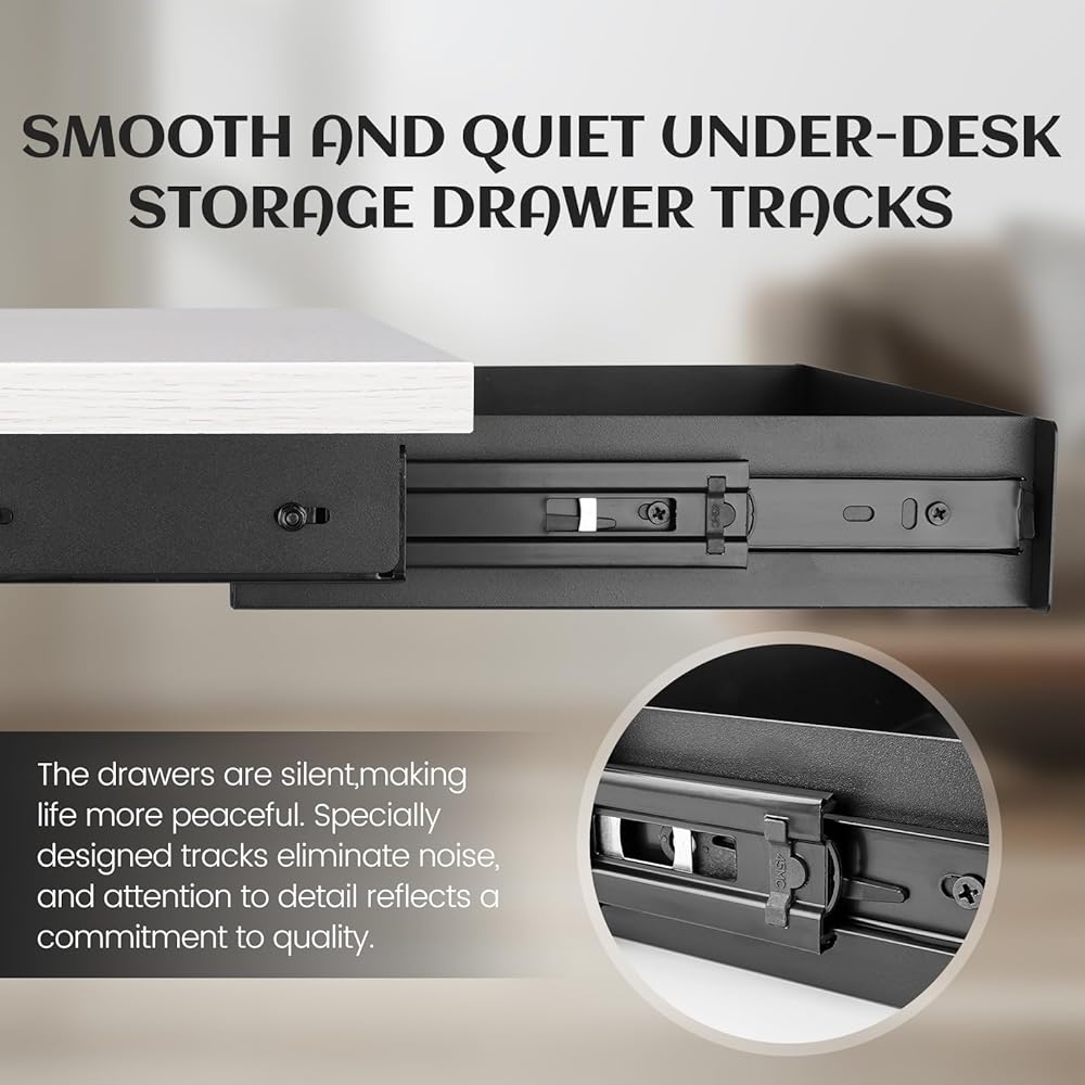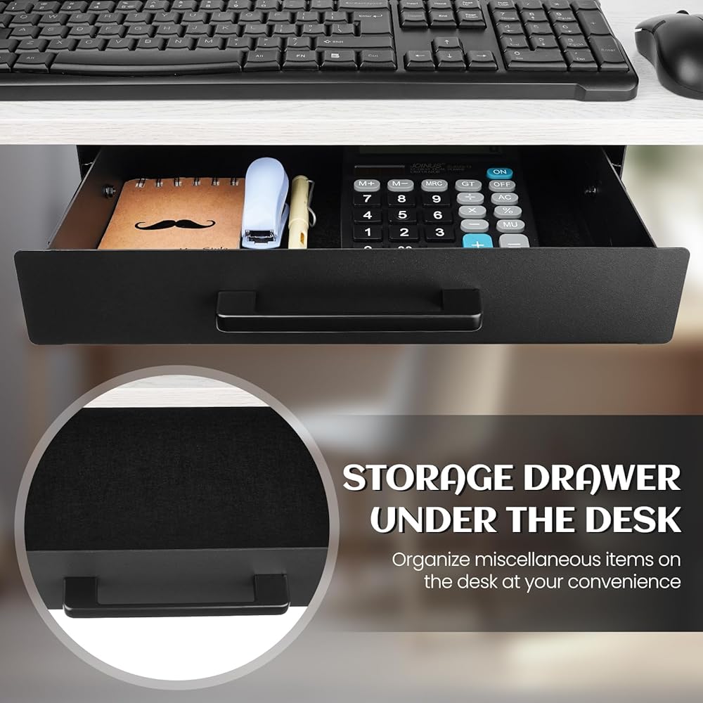 • درج انزلاقي سلس أسفل الرف: ينزلق الدرج الموجود أسفل الرف دون عناء على مسارات هادئة وسلسة، مما يضمن سهولة الوصول إلى أغراضك. يتيح لك المقبض الأمامي الأنيق سحب الدرج للداخل والخارج بسهولة، مما يجعله مثاليًا للاستخدام اليومي. حافظ على مساحة العمل الخاصة بك تبدو أنيقة واحترافية أثناء تخزين الورق وأدوات الكتابة والأجهزة الإلكترونية واللوازم المكتبية والمزيد!