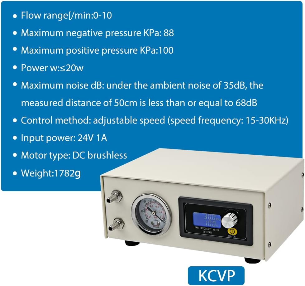 الجهد: 24 فولت، 1 أمبير، معدل التدفق: 0-10 لتر/دقيقة (سرعة قابلة للتعديل)، مادة الحجاب الحاجز EPDM، الحد الأقصى للضغط السلبي: 88 كيلو باسكال، الحد الأقصى للضغط الإيجابي: 100 كيلو باسكال، الطاقة ≥ 20 وات، الضوضاء ≥ 68 ديسيبل (الضوضاء المحيطة 35 ديسيبل، مقاسة عند مسافة 50 سم).