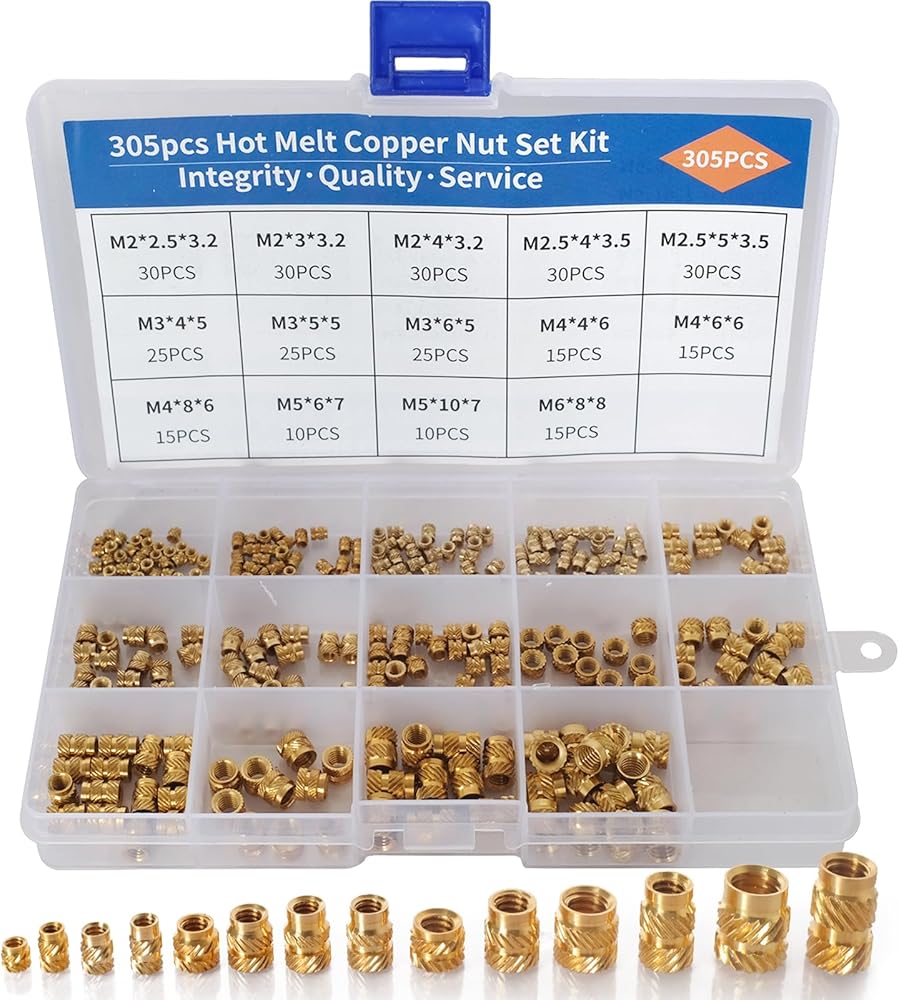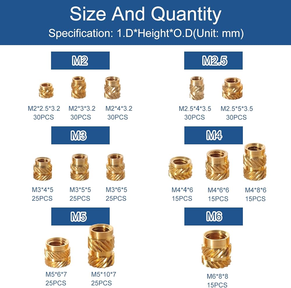 هذه المكسرات المضمنة ذات الخيوط النحاسية المخرشة مصنوعة من النحاس المتين. قوة عالية دون تشوه، ومقاومة للتآكل والتآكل. تتضمن هذه المجموعة 305 مجموعة من الصواميل المخرشة النحاسية الملولبة داخليًا مع 14 مواصفات و6 فتحات (M2، M2.5، M3، M4، M5، M6)، تتضمن المجموعة: M2*2.5*3.2---30 قطعة، M2*3 *3.2---30 قطعة، M2*4*3.2---30 قطعة، M2.5*4*3.5---30 قطعة، M2.5*5*3.5---30 قطعة، M3*4*5---25 قطعة ، M3 * 5 * 5 --- 25 قطعة، M3 * 6 * 5 --- 25 قطعة، M4 * 4 * 6 --- 15 قطعة، M4 * 6 * 6 --- 15 قطعة، M4 * 8 * 6 --- 15 قطعة ، M5 * 6*7 --- 10 قطعة، M5 * 10*7 --- 10 قطعة، M6 * 8*8 --- 15 قطعة.