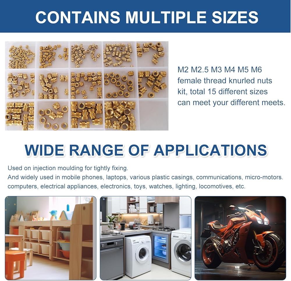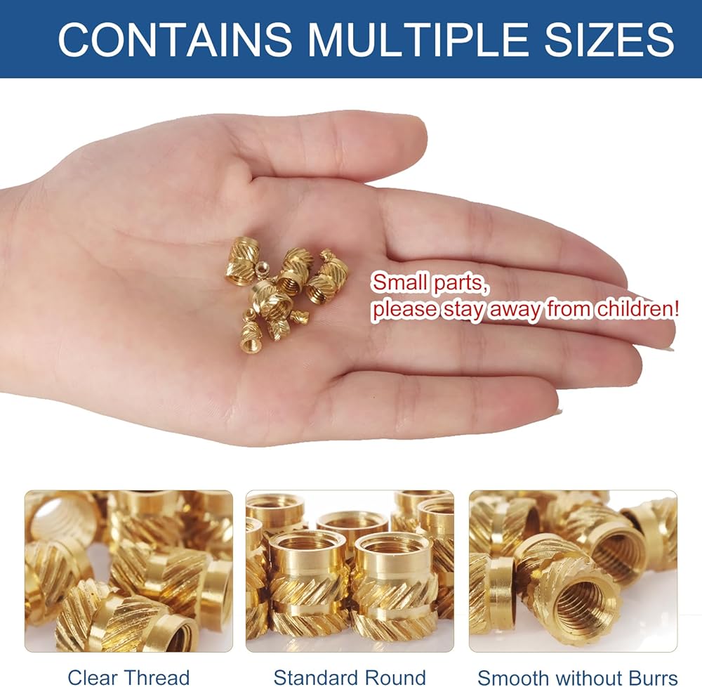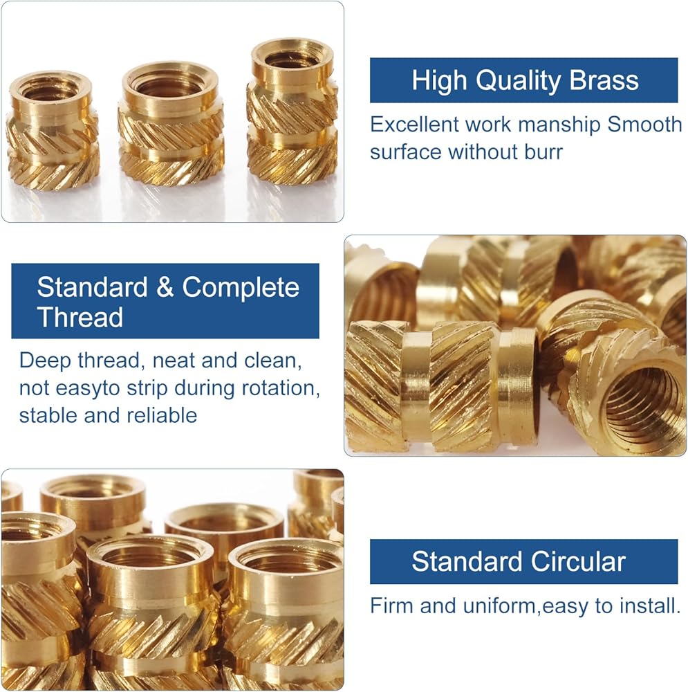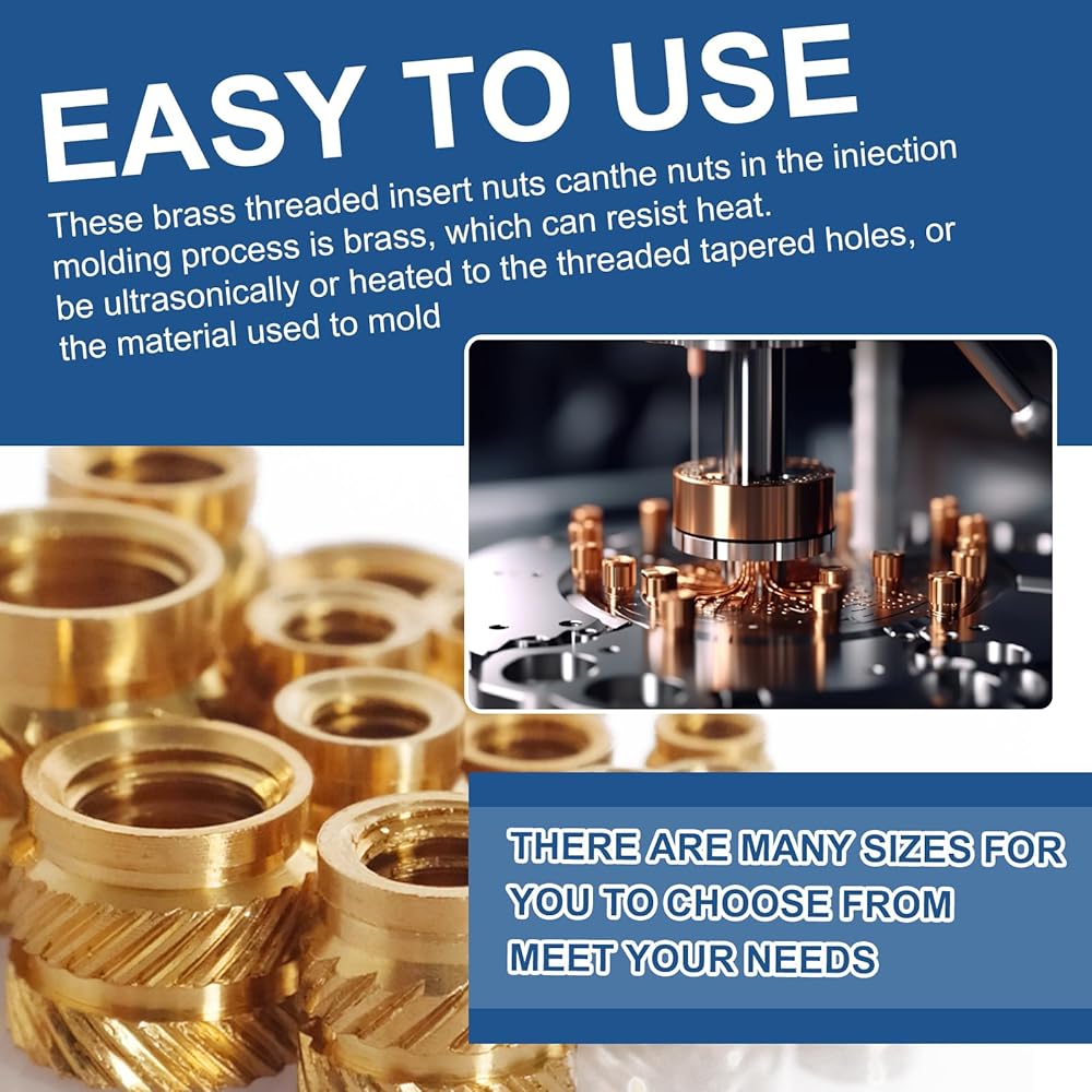 يمكن استخدام هذه الإدخالات الحرارية على نطاق واسع في قالب الحقن للتثبيت بإحكام. يمكن تركيبه بالموجات فوق الصوتية أو الحرارة في فتحة مدببة للخيط، أو تشكيله أثناء الحقن. تنطبق أيضًا على تجميع لوحات الدوائر وفي مجال الإلكترونيات. يتم تشكيل البلاستيك حول الملحق النحاسي. سيكون من الأفضل وضع شيء ما في الخيوط لمنع البلاستيك من الذوبان في المنتصف. باستخدام مكواة لحام عادية، يمكنك بسهولة وضعها في ثقوب مطبوعة ثلاثية الأبعاد.