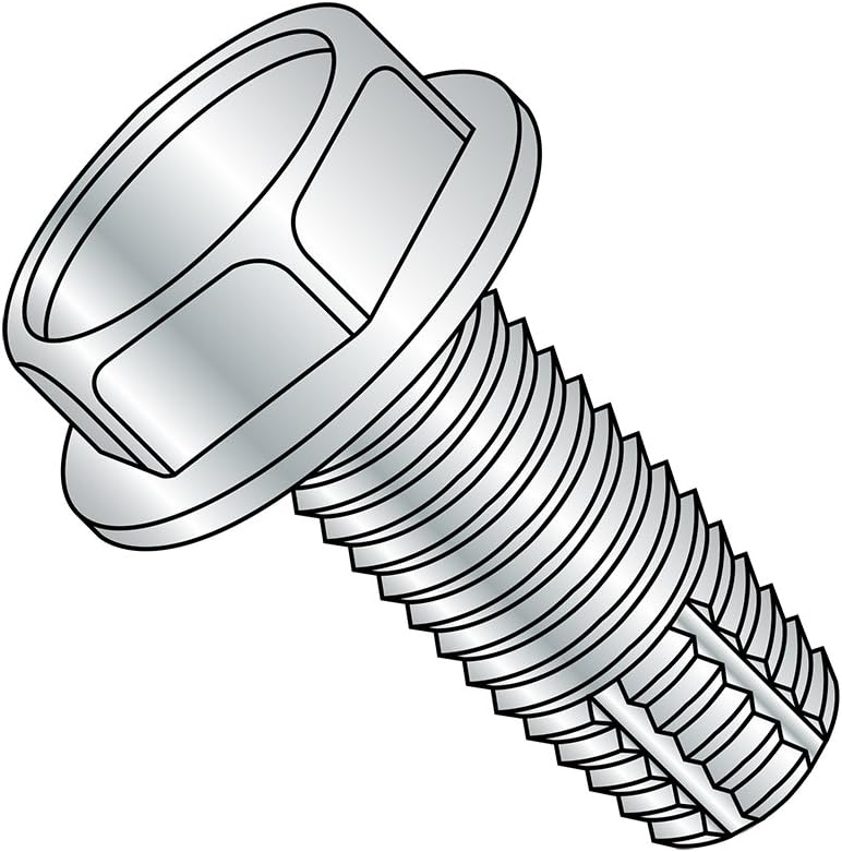 The steel thread cutting screw has a zinc plating, a Type F point style, and a hex washer head. The type F point is suitable for heavy gauge sheet metal, aluminum, cast iron, brass, and plastic. The screw has machine screw threads that taper down to a blunt point with multiple cutting edges and chip cavities. Steel is often used in applications where strength is the primary consideration. The zinc plating offers corrosion resistance and has a reflective appearance. The hex washer head has six flat sides that a wrench can grip to turn from the side, enabling use when there is no space above the head for a screwdriver. The flange acts like a washer to increase the fastener's bearing surface and distribute the clamping force over a larger area, providing grip and reducing damage to mating surfaces.