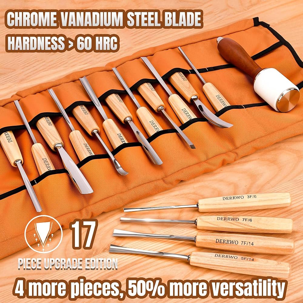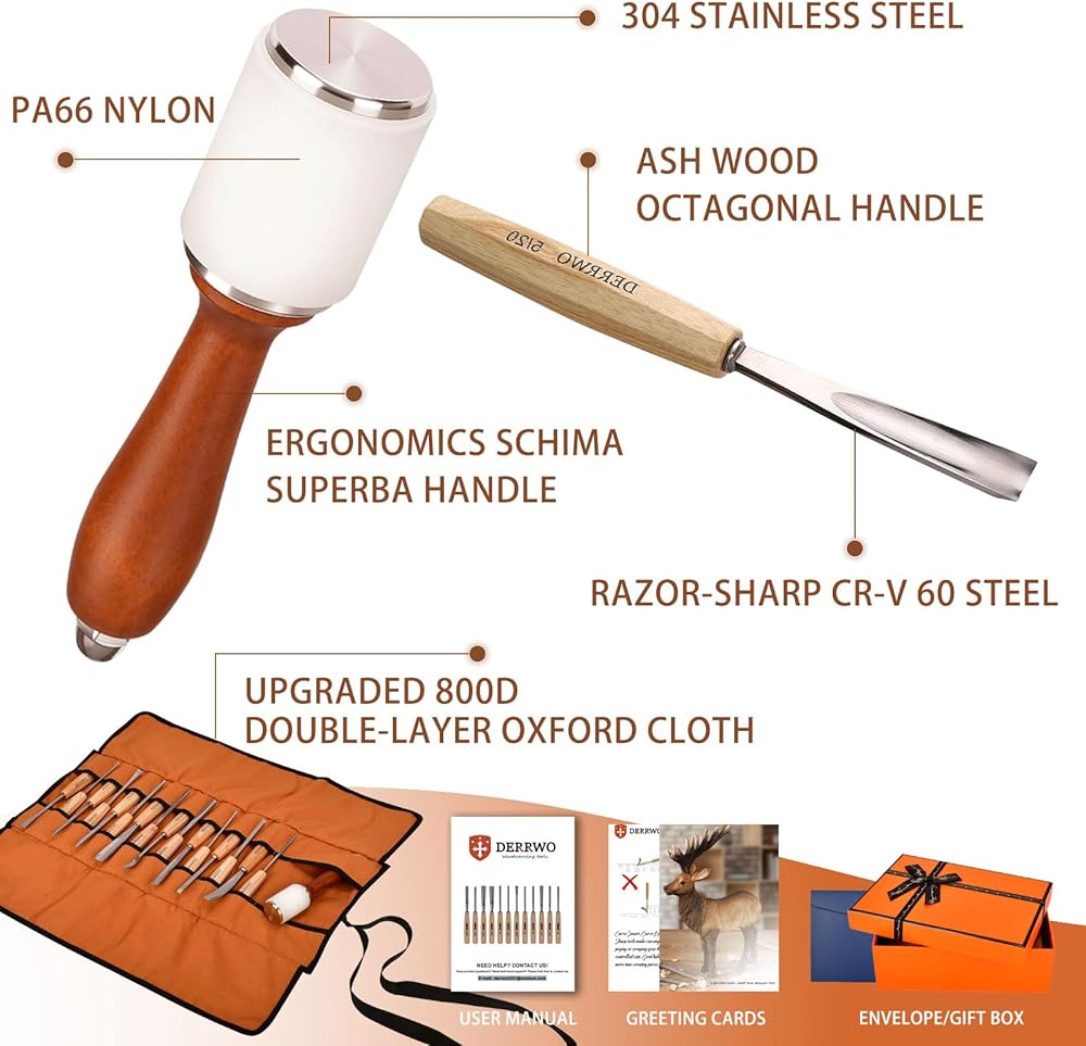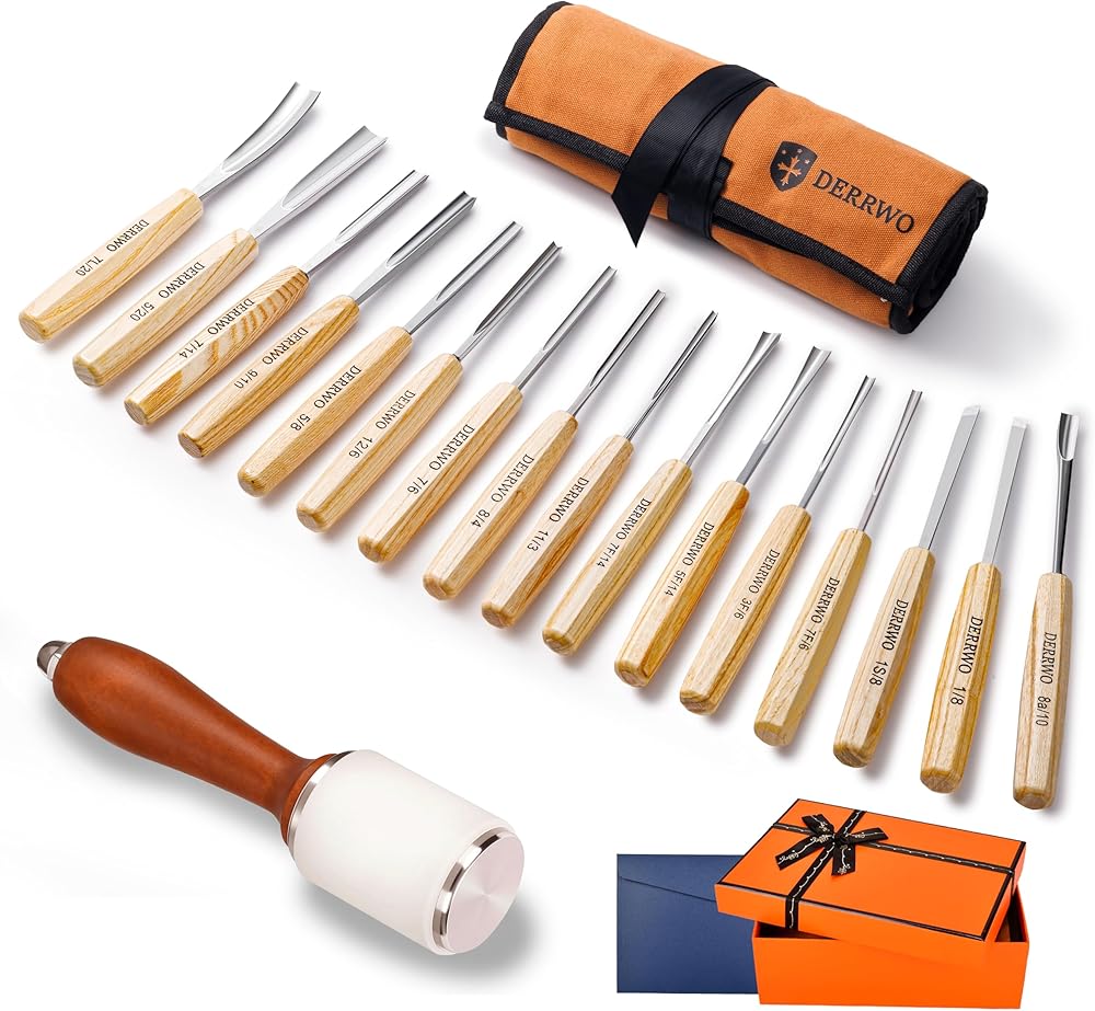【مجموعة نحت الخشب الفاخرة】: كل ما تحتاجه لبدء نحت الخشب! تشتمل هذه المجموعة الكاملة على 16 إزميلًا احترافيًا، ومطرقة نحت واحدة، وحقيبة قابلة للطي، ودليل تعليمات، وصندوق هدايا معبأ بشكل جميل مع بطاقة تهنئة ومظروف. مثالية للمبتدئين أو كهدية لعشاق النحت - ابدأ في إنشاء أعمال فنية خشبية مذهلة على الفور!