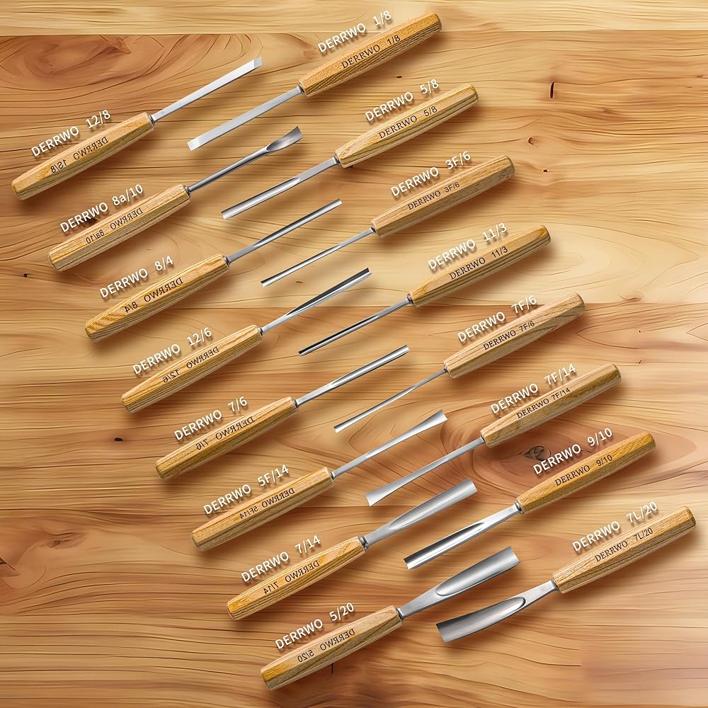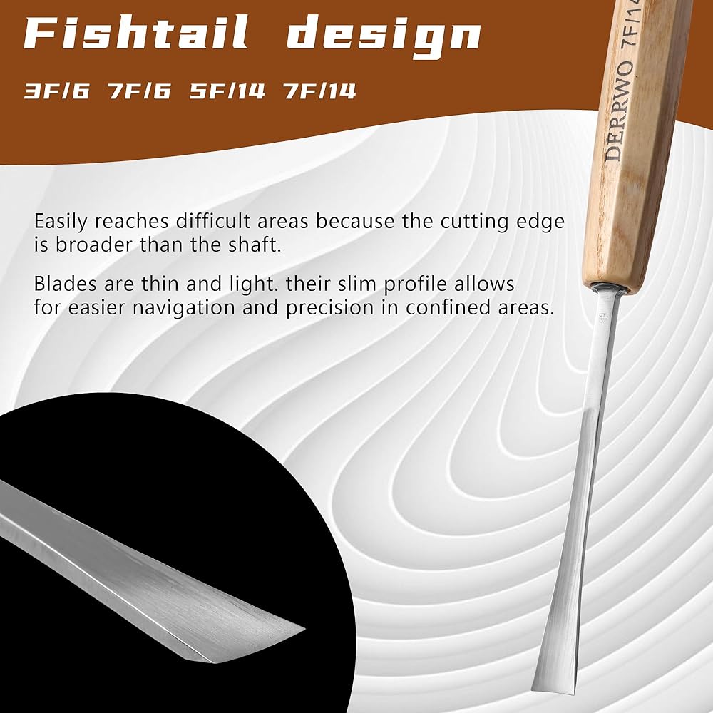 【دقة نحت معززة】: تصميم ذيل السمكة الفريد من نوعه لـ 3F/6، 7F/6، 5F/14، 7F/14 في مجموعة الإزميل الاحترافية المكونة من 17 قطعة يمكّن النحات من التقطيع إلى الزوايا بطريقة لا تستطيع أدوات النحت الأخرى القيام بها، مما يجعل من السهل العمل في المساحات الضيقة أكثر من نحت الكفاف العادي.