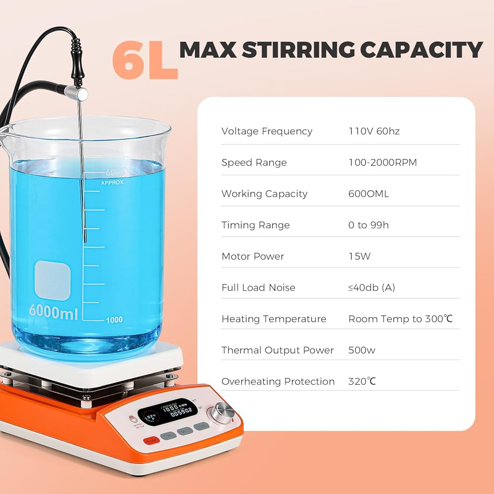 اختيار مثالي: سعة التحريك 6 لتر، إعداد سرعة قابل للتعديل من 100 إلى 2000 دورة في الدقيقة، إعداد وقت من 0 إلى 99 ساعة، إعداد درجة حرارة تصل إلى 300 درجة مئوية. ويمكن تسخين اللوحة الساخنة للنمام المغناطيسي وتحريكها في وقت واحد أو بشكل منفصل.
