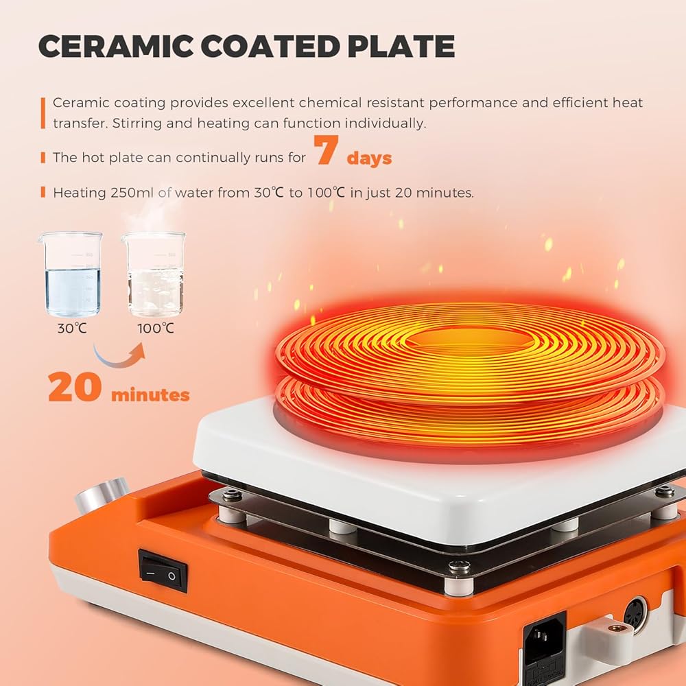 توصيل حراري فعال: توفر الطلاءات الخزفية توصيلًا حراريًا جيدًا، وتبديدًا موحدًا للحرارة، وتبريدًا سريعًا. المحرك القوي لا يحتاج إلى صيانة ويدعم التشغيل المستمر للوحة التسخين العلمية لمدة 7 أيام. عندما تتجاوز درجة الحرارة 320 درجة مئوية، سيتوقف التسخين تلقائيًا لضمان السلامة.