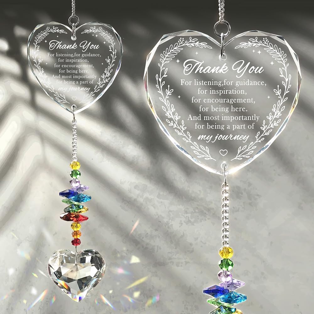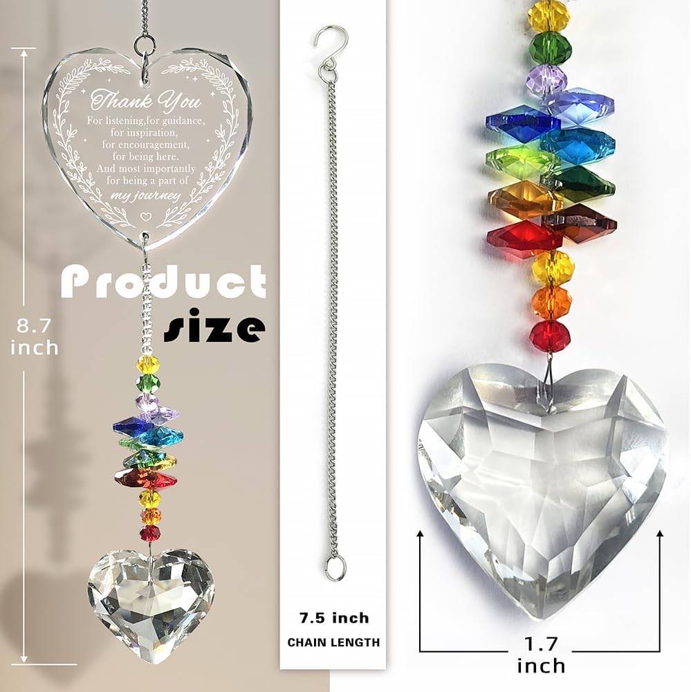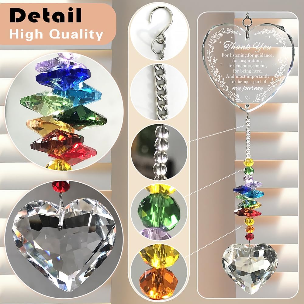 ❤【Crystal Suncatcher】This sparkling heart-shaped crystal suncatcher is crafted from premium high-transparency crystal with precise cutting and meticulous craftsmanship. Complemented by heart-shaped glass prisms print with meaningful inscriptions and metal chains, it radiates vibrant colors and dazzling brilliance. Each crystal exhibits a beautiful and unique spectrum of colors. Under intense illumination, these prisms capture and refract light into captivating luminous patterns.