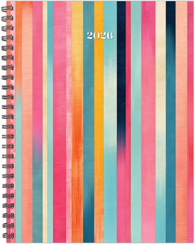 The Super Stripe Weekly 2026 Planner is a planner calendar designed for weekly engagement throughout the year. The planner features monthly snapshots with sidebars, two-page weekly spreads, year-at-a-glance views, and yearly overview pages. It supports activities such as detailed planning, creating weekly shopping lists, tracking weekly priorities, daily habit tracking, gratitude recording, and organizing special events. The planner includes dedicated spaces for writing monthly priorities, weekly shopping lists, week's priorities, daily habit tracking, and gratitude notes. It also contains a special section for passwords and important contact information, along with stickers to mark special events. This planner calendar measures 8.5" x 11" when closed and 17" x 11" when open, beginning on 1/1/2026. It is equipped with spiral binding, monthly faux tabs, and a storage pocket for organizing important items. The planner includes over 300 stickers, a year-at-a-glance view, and yearly overview pages for 2026 and 2027. The format is designed to facilitate organization and reference for each week and month. The planner is constructed with a plastic-free cover and uses soy-based inks on high-quality paper. The spiral binding allows for easy page turning and flat display. The storage pocket is intended for keeping essential documents or notes. This planner serves as a practical tool for managing schedules, tracking habits, and recording important information throughout the year.