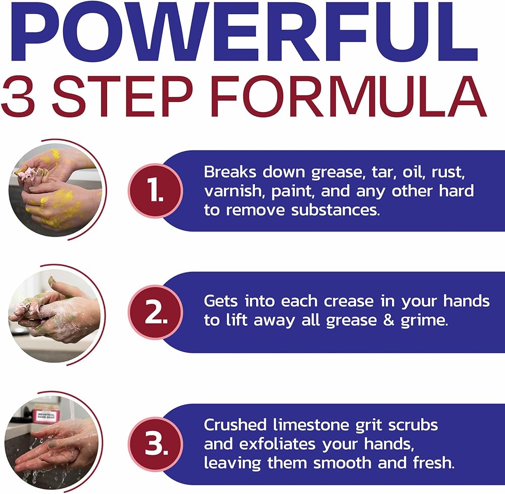 تركيبة صابون اليد الثورية المكونة من 3 خطوات - مصممة لمنح يديك تجربة التنظيف المثالية. أولاً، قم بقطع الشحوم القاسية باستخدام معجون الصابون القوي الخاص بنا. ثانيًا، تعمل أجهزة غسل المعادن المملوءة على إزالة الأوساخ والحصى بشكل فعال. ثالثًا، اغسلي جميع البقع والروائح المتبقية بالماء للحصول على لمسة نهائية منعشة واترك يديك ناعمة ورطبة.