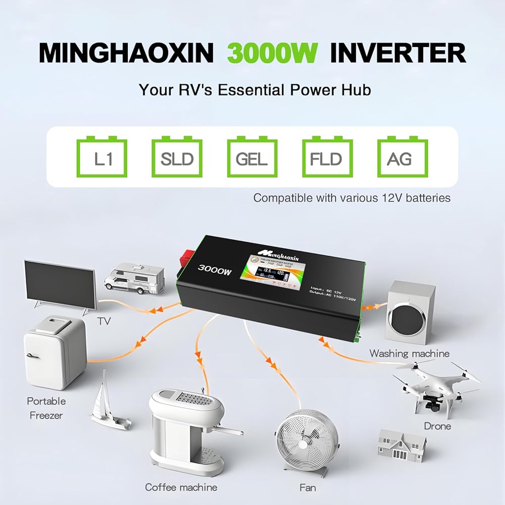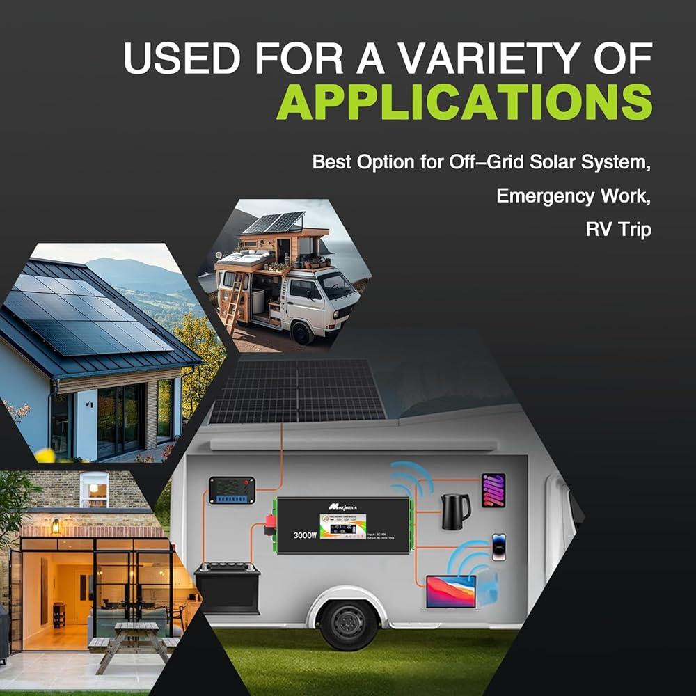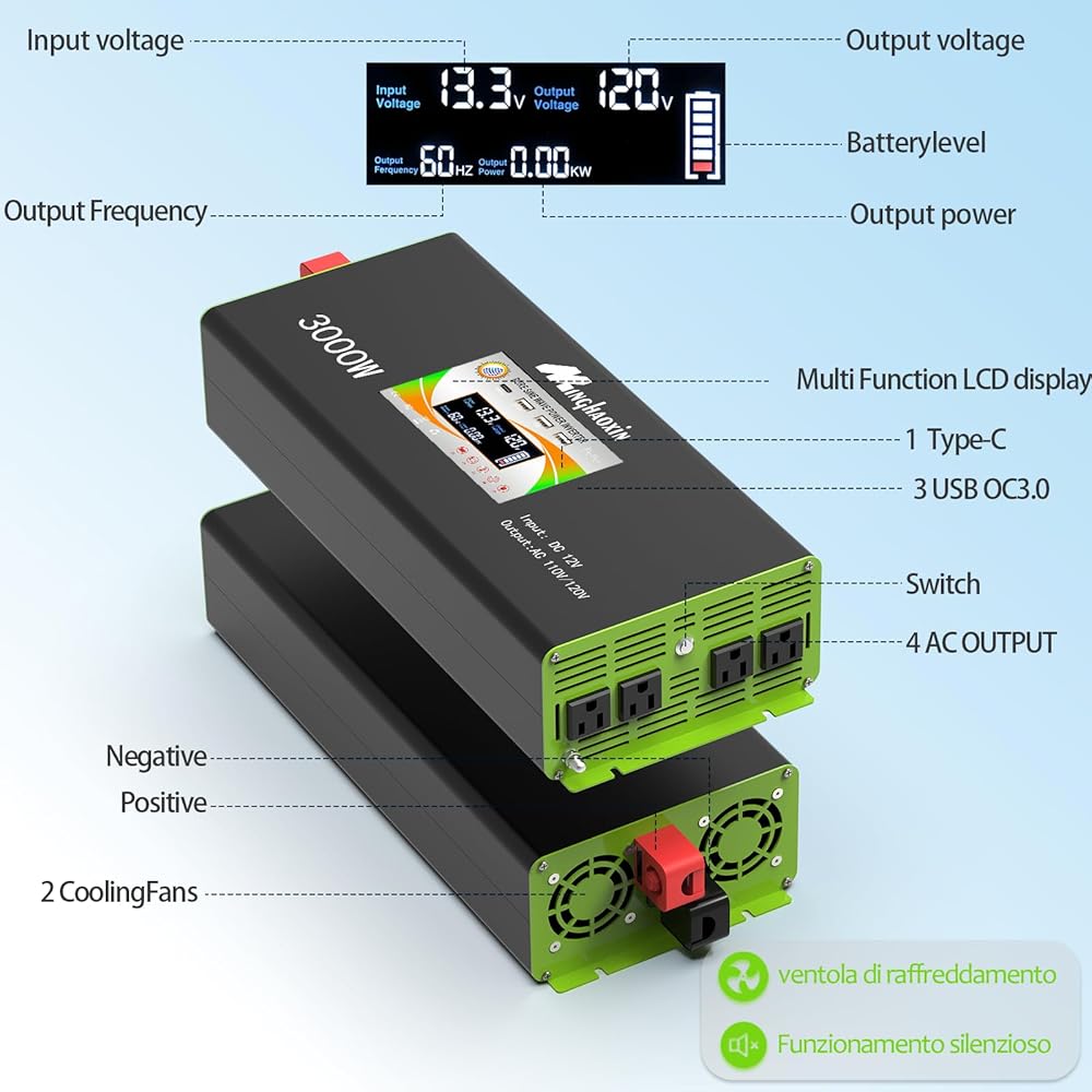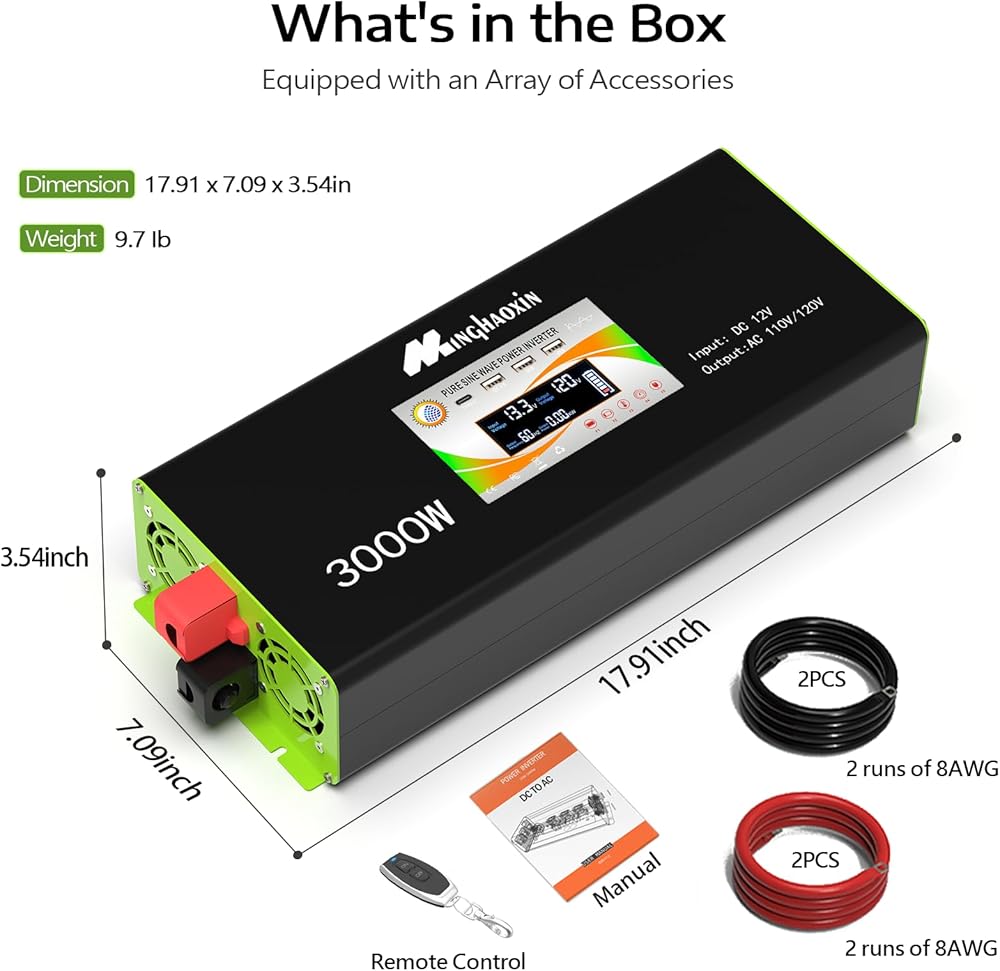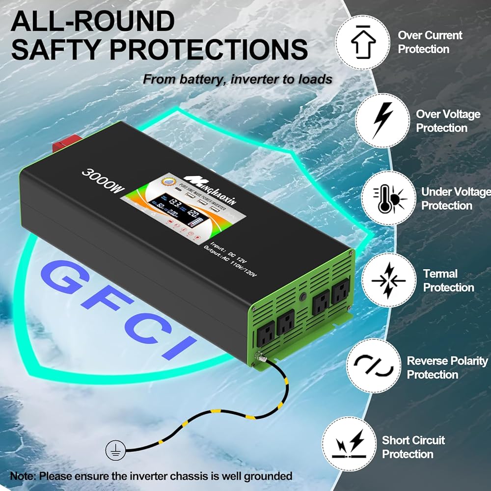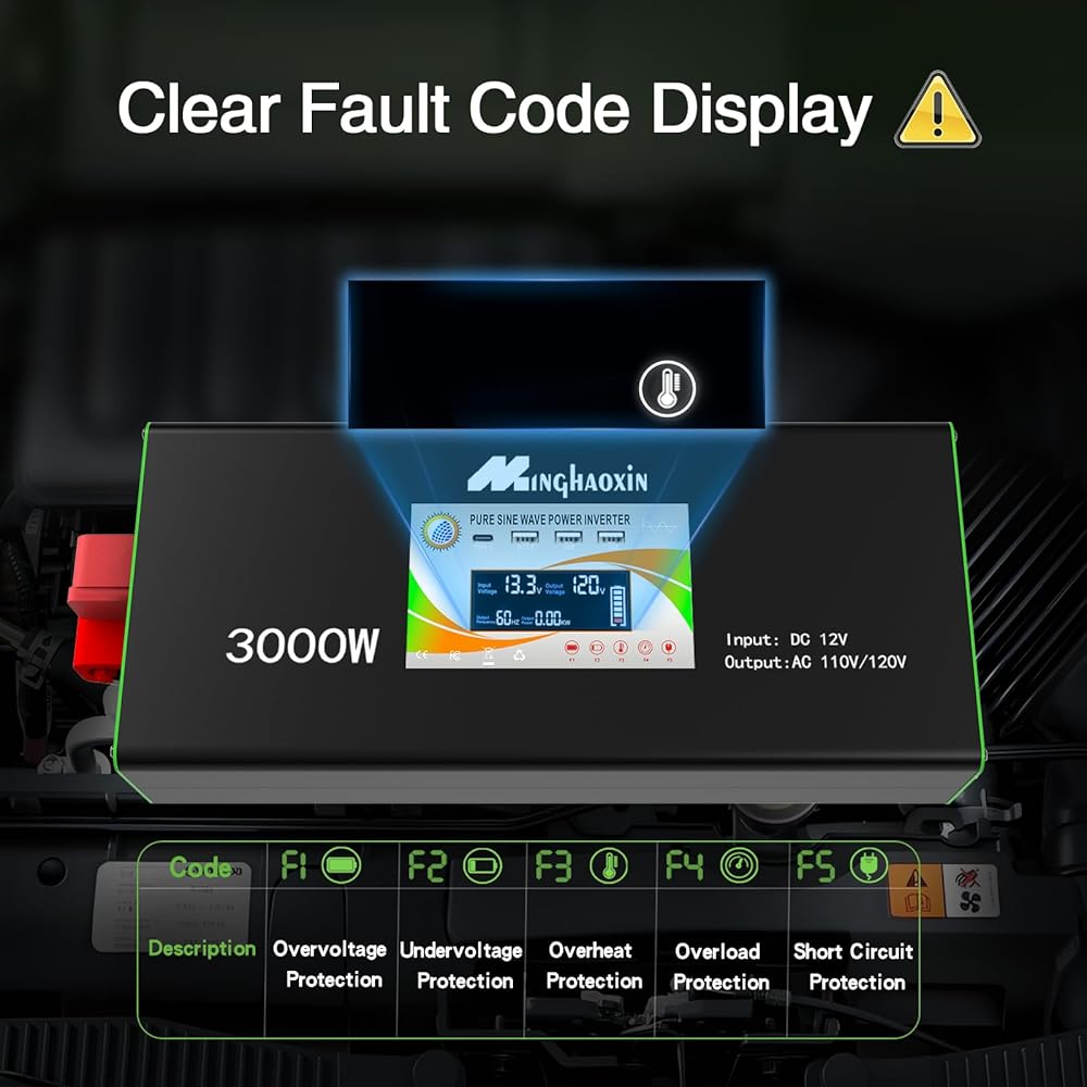 【موجة جيبية نقية لطاقة مستقرة】يوفر طاقة تيار متردد نظيفة وموثوقة 110/120 فولت، يوفر هذا العاكس بقدرة 3000 واط مخرج موجة جيبية نقية للإلكترونيات الحساسة مثل أجهزة الكمبيوتر المحمولة وأجهزة التلفزيون والأجهزة الطبية. استمتع بأداء سلس وهادئ بدون ضوضاء أو تداخل — تمامًا مثل الكهرباء المنزلية.