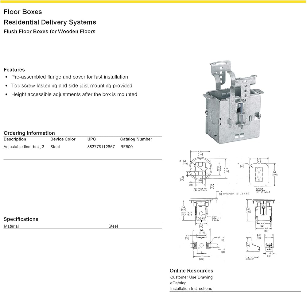 تسمح الصناديق الأرضية الخشبية بوضع الطاقة الكهربائية أو مزيج من أجهزة الطاقة والصوت/البيانات. يتم تركيب الصناديق بسهولة على الأرض ويمكن تعديل ارتفاعها (حتى ¾ انش) للحصول على محاذاة وملاءمة مثالية. صندوق أرضي قابل للتعديل؛ عمق 3 انش؛ ثلاثة ½ انش: واحد في الأسفل؛ واحد على كل جانب؛ مشابك كيبل مغلفة غير معدنية على كل جانب.