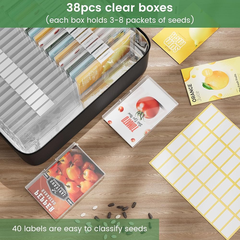 Premium Seed Storage Organizer: This comprehensive seed organizer storage box set includes a durable black Oxford cloth & Foil insulated bag with handle and zipper, 38 clear plastic seed storage boxes, and 40 labels. This large capacity seed box storage organizer can easily store and precisely categorize 150 to 300 seed packets or envelopes, providing a comprehensive solution for organizing and protecting your seeds.