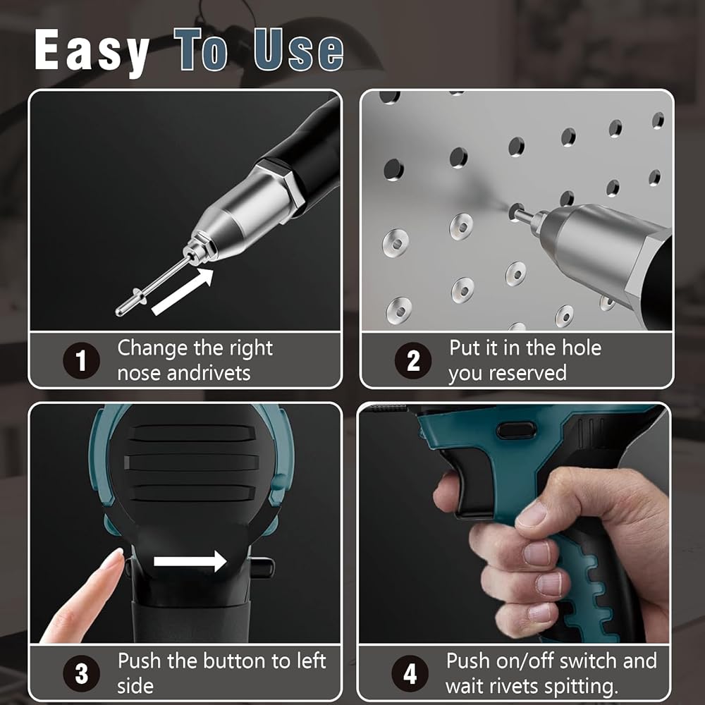 【Package Included】 Includes: 1 rivet gun, 1 wrench, 50 rivets, and 3 nozzles (one each for 3/16", 5/32", and 1/8"). Note: The battery and charger are sold separately.