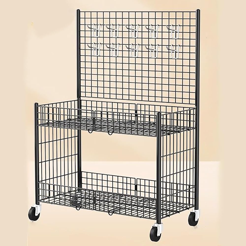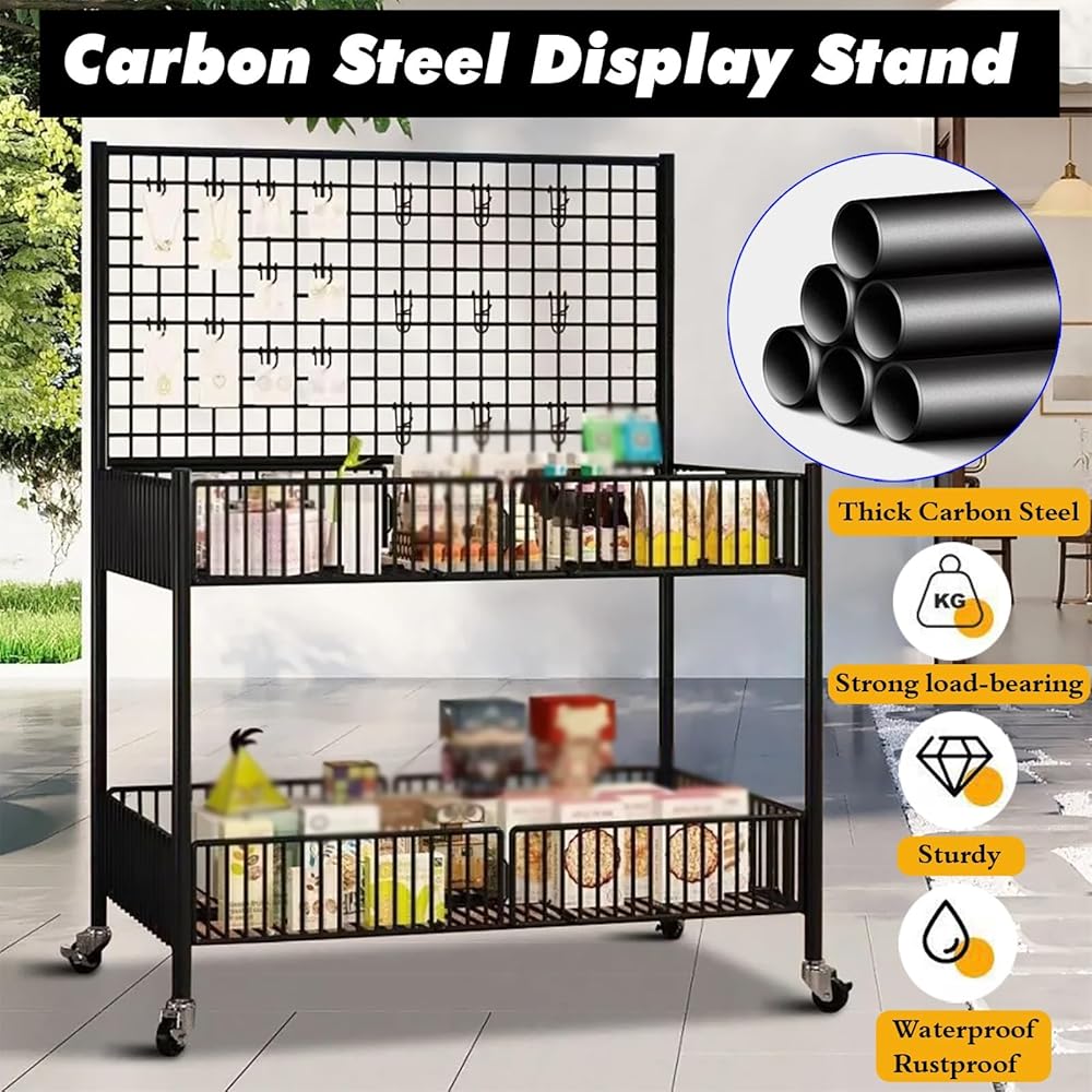 • Versatile Storage & Display The 2-tier design includes a gridwall panel for hanging items and a diamond mesh shelf for storing heavy goods. Includes 10 Gridwall hooks for maximum versatility. Organize and showcase your products with ease, whether it's clothing, tools, or craft supplies