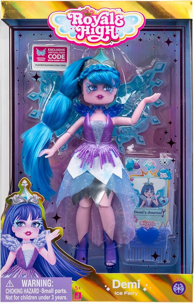 Step into a magical world of fashion and style with Royale High, a virtual realm bound to captivate! Inspired by the game, Demi the Ice Fairy 9” Fashion Doll is a must-have for every young fashionista. With her sensational shoes and icy skirt, Demi is ready to sparkle like fresh snowfall. She's added a finishing flurry to her look with a silver crown and a frozen comb, with her crystal clip-on wings shining in the frosty air. She keeps a fairy journal close to her chest to capture her memories of Royale High, so heart-warming they could even melt her own ice! Collect all the Series 2, 9” Fashion Dolls and mix and match their interchangeable outfits and wings to create your unique look. The Series 2 fairies each represent an Element, and each doll has a redeemable UGC game code that lets you accessorize your in-game doll across all experiences—officially licensed. Ages 5+.