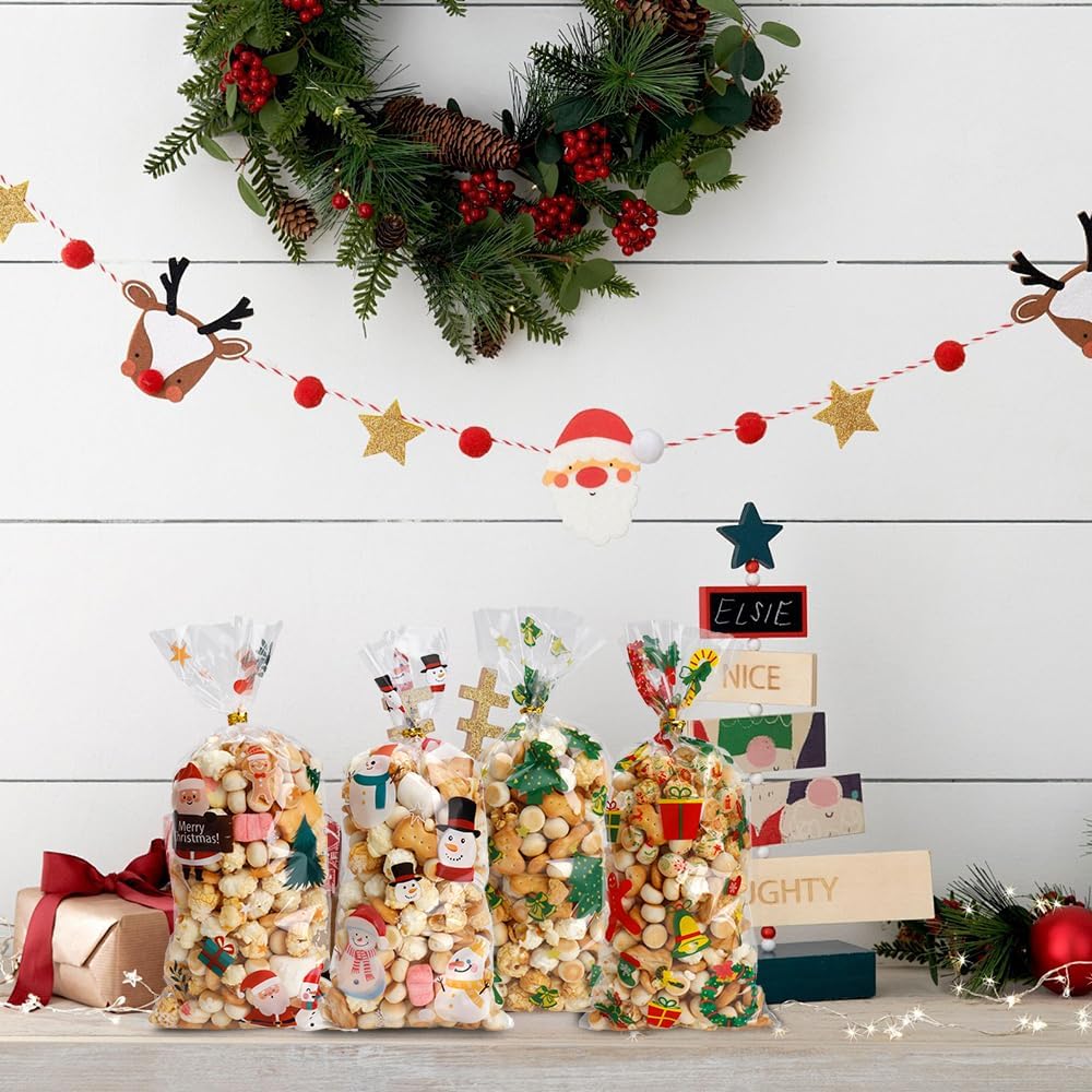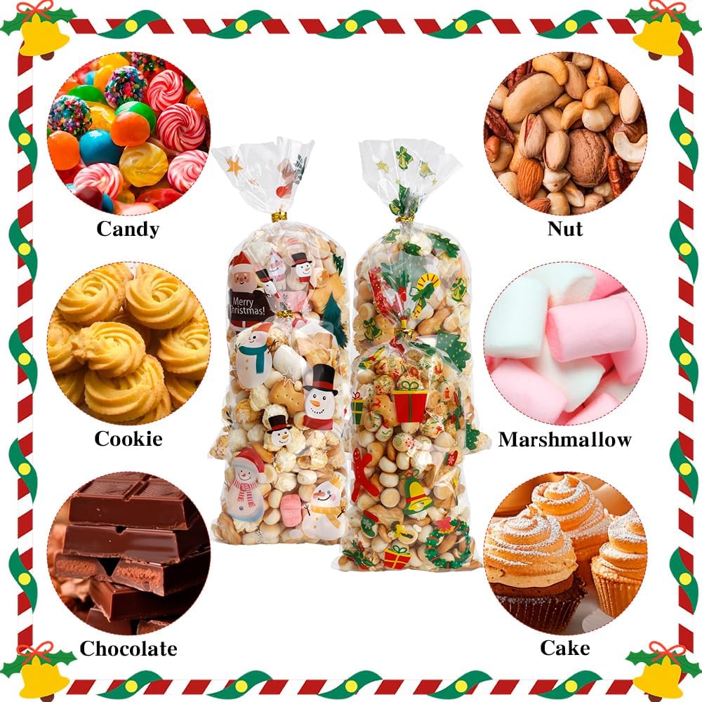 Perfect Size: Each Christmas goodie bag measures 13x27 cm (5x11 inches), and comes with a 8.8 cm (3.5 inch) twist tie. The generous size is perfect for holding a wide variety of items, including small gifts, snacks, chocolates, fruits, marshmallows, candies, baked goods, toys, popcorn, cookies, and more