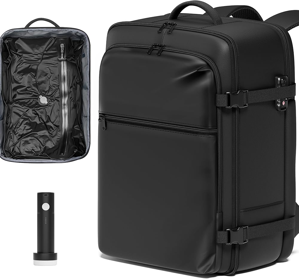 Vacuum Backpack for Travel: The SUOCO Backpack features a built-in vacuum-compression bag that allows you to pack up to 60 liters of clothing—far more than a 20-inch carry-on can hold. This breakthrough in travel convenience and storage efficiency lets you fit maximum capacity into a compact form, so you never have to compromise on what to bring. A wireless electric travel pump is included to compress everything in just 10 seconds.