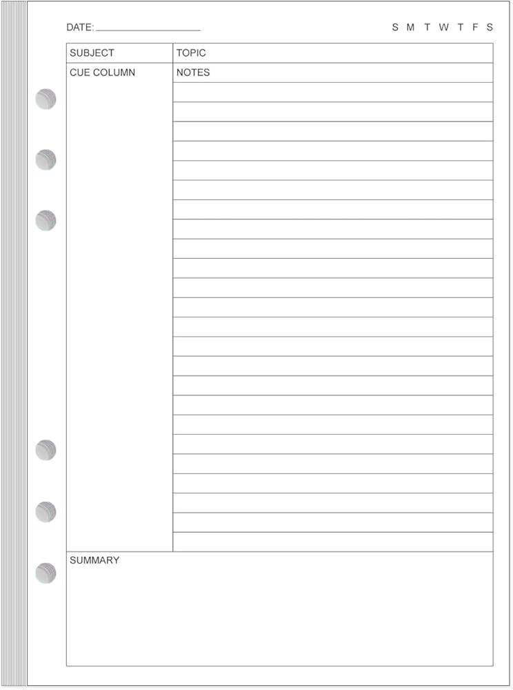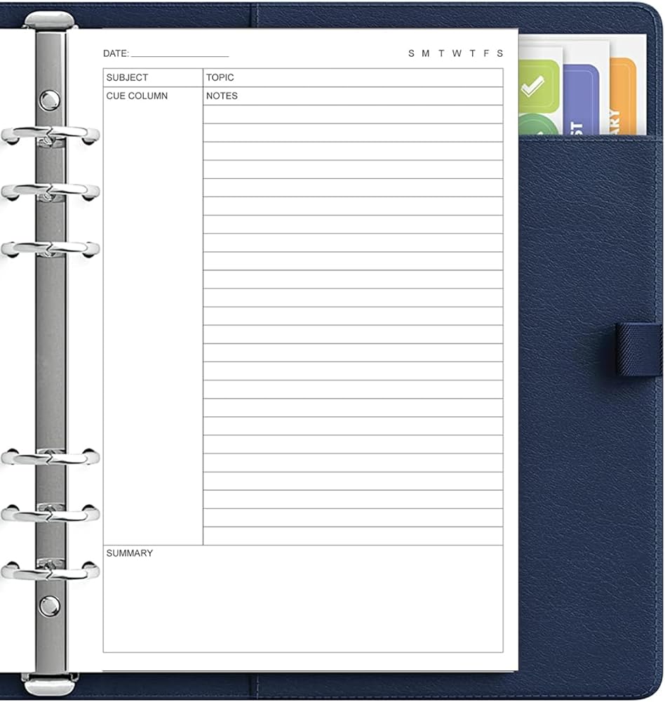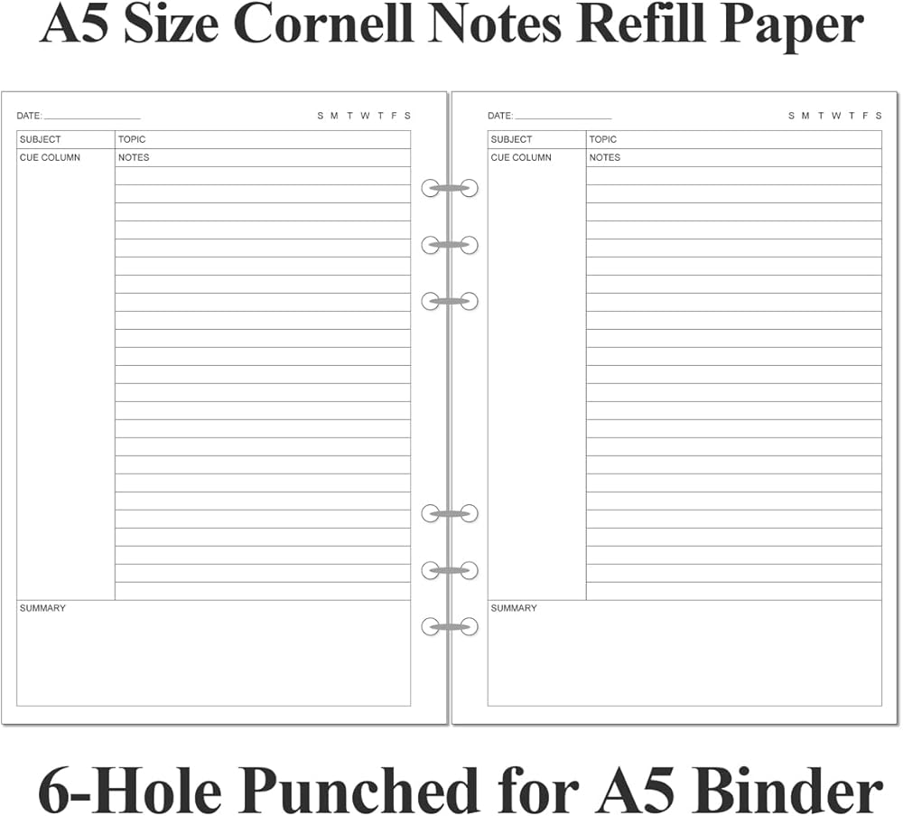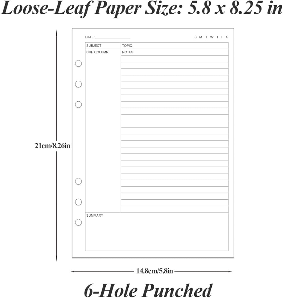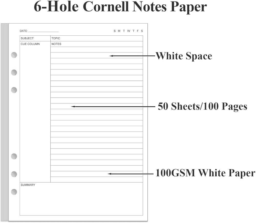 This 6-hole cornell style note taking loose leaf paper size of 5.8" x 8.5", A5 Size 50 sheets/100 pages for 100 days, improve your productivity with this daily organizer. Cornell notes papers for compatible improve your productivity with this daily organizer. cornell notes papers for perfect fit standar 6-hole inserts, refill paper for A5 binder, SIX (6) ring binders, like Filofax, Kikki k, Carpe Diem (A5), DON'T fit 3/7 ring binders. Refill cornell paper is used to high quality 100gsm pure white premium acid-free paper, so you can confidently use most pens, pencils, and markers without ghosting and bleed-through. This refill cornell notes paper for school notes, meeting notes, or any form of writing, our ruled sheets have subtle gray lines spaced by a quarter inch.