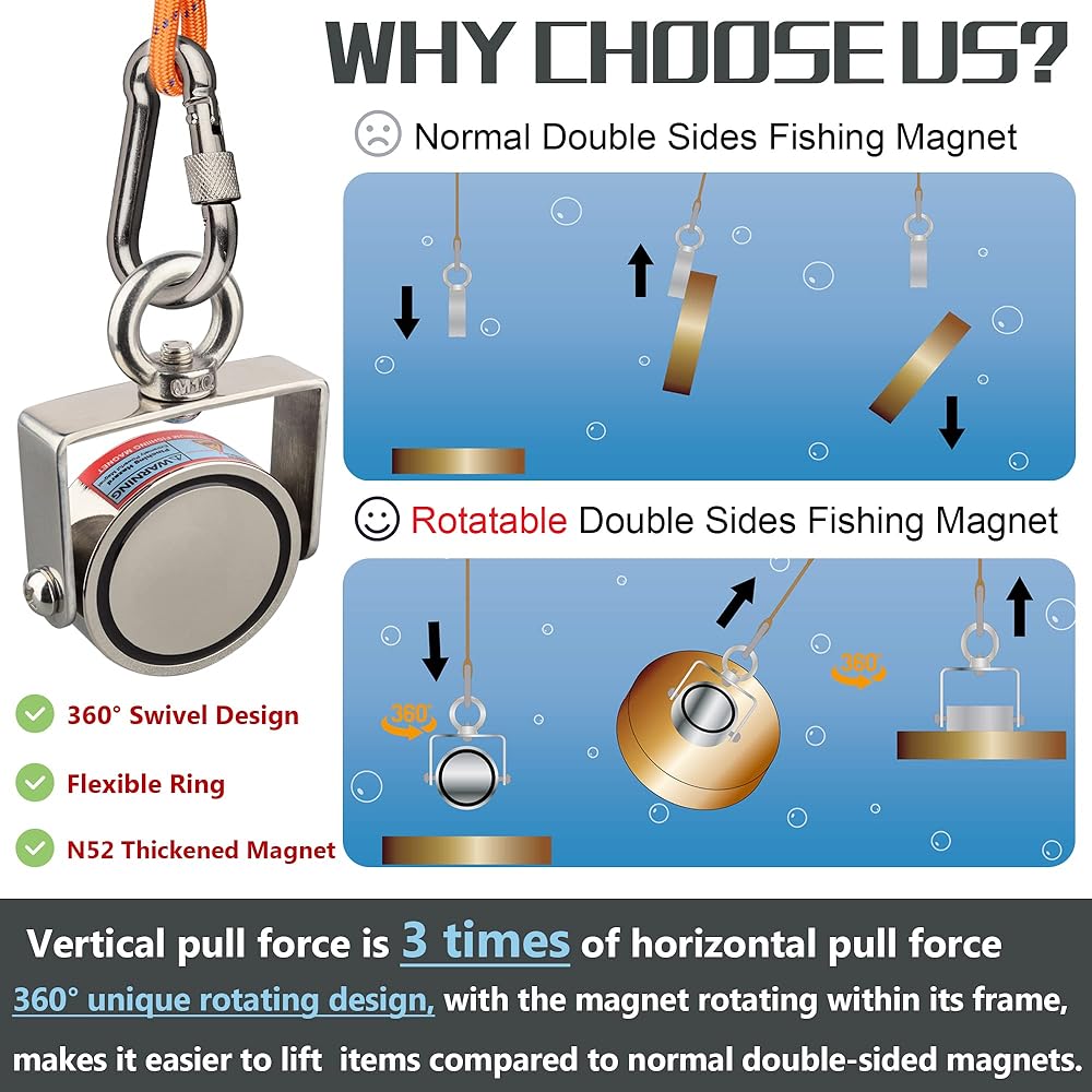 🧲[مجموعة صيد مغناطيسية قوية مزدوجة الجانب]: مغناطيس نيوديميوم N52 عالي الجودة يدور بشكل عشوائي داخل إطاره. سيسهل ذلك العثور على الأشياء والتقاطها، سواء باستخدامها للعبور أفقيًا، أو استخدامها للصيد عموديًا.