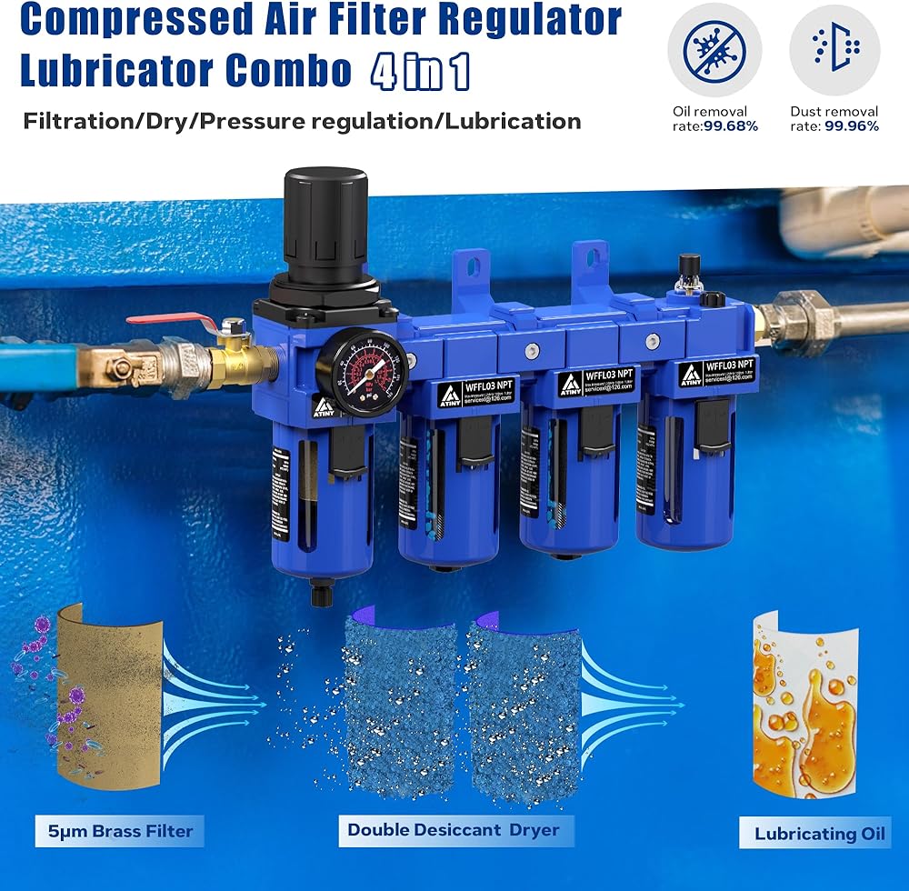 مجموعة منظم فلتر الهواء ATINY 1/4 بوصة مع مقياس الضغط، خرطوشة فلتر نحاسية 5 ميكرون، تصريف شبه تلقائي