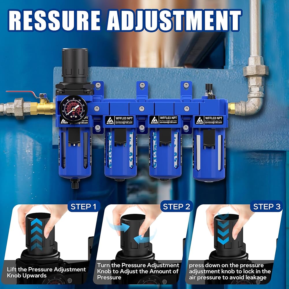 التنظيم: تحتوي الوحدات على منظم بمقبض تحكم في الضغط قابل للتعديل، مما يتيح لك خفض ضغط الهواء أو الحفاظ عليه وفقًا لاحتياجاتك. يضمن المنظم ضغطًا ثابتًا للخارج، حتى في حالة وجود تقلبات في ضغط المدخل وتدفقه.