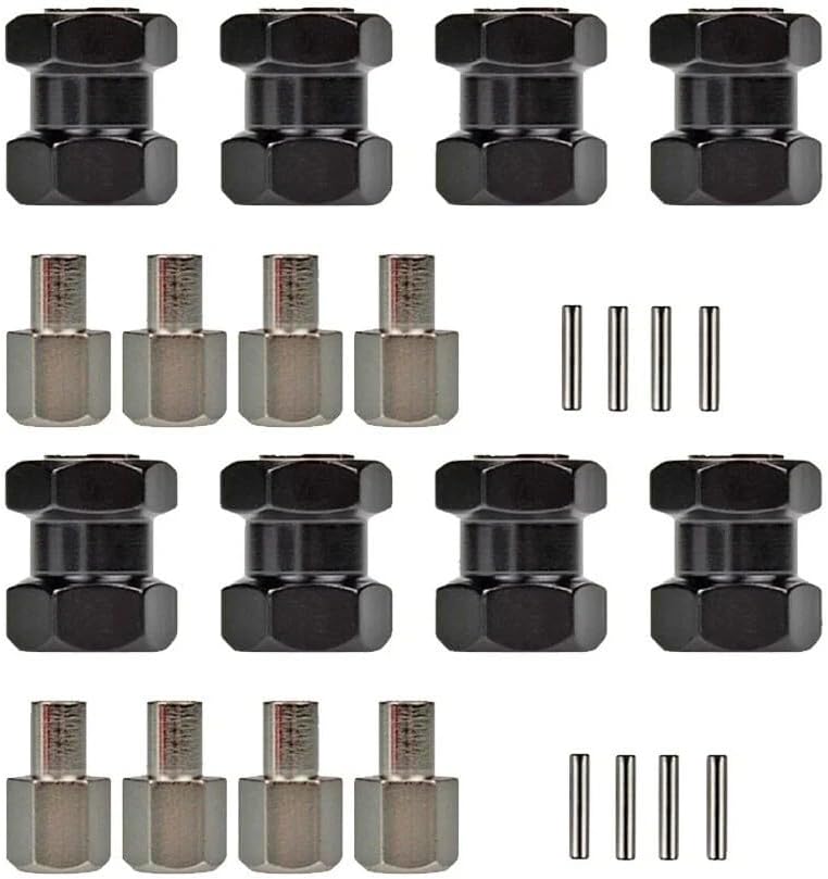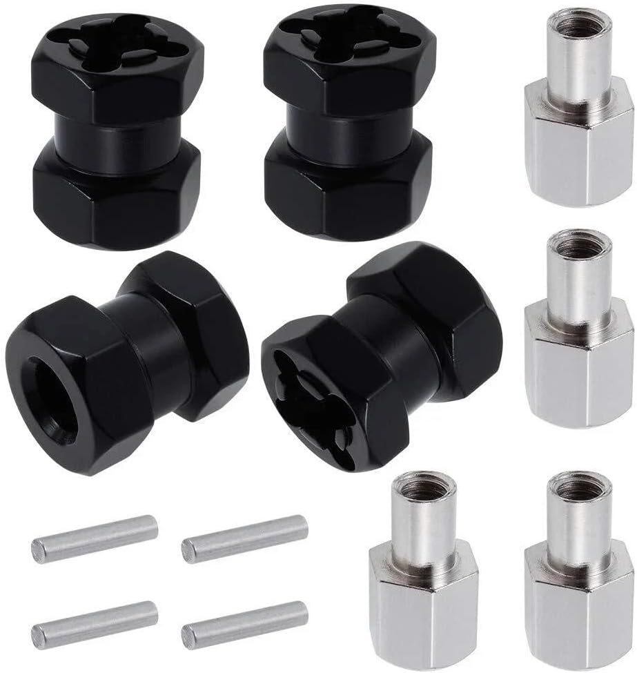 Adding a (12mm) width extension per side of the vehicle for a wider, more stable, stance. 12mm Wheel Hub Extensions add 12mm to the track width of your Axial SCX10 Rc4wd Wraith D90, and Wraith Crawler etc Top-Quality Materials & Superb Craftsmanship Precision anodized, Aluminum material, lightweight and durable Lightweight upgrade instantly enhances overall performance in handling and durability. Extensions fit over axles and secure to axles with included screw pins. Wheel is secured with long aluminum wheel nut. Material: Aluminum Alloy Total length: 15mm Hex size: 12mm Screw Head Diameter: Approx. 8mm Pin: 2*10mm Color: Black Fit for: 1/10 RC Rc Crawler Scx10 Rc4wd Wraith D90 etc. Make sure your 4 wheels use a 12mm hub already Suitable for hub aperture 7mm, the nut with a 5mm Suitable for screwing on a 4mm axle screw The hex adapter has a 6mm hole in it Suitable for the hole in the axle is 2mm (if no hole these wont be suitable) 8 x RC Hex Hub Extension Adapter 8 x Nail 8 x Pin