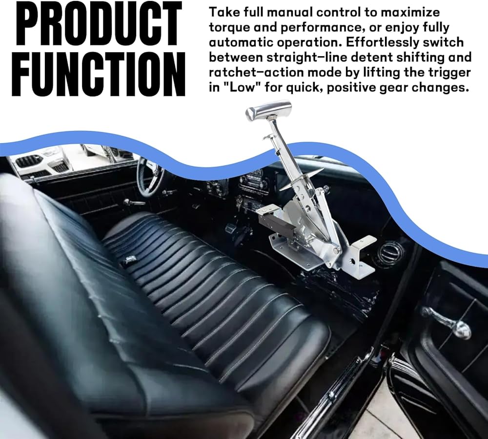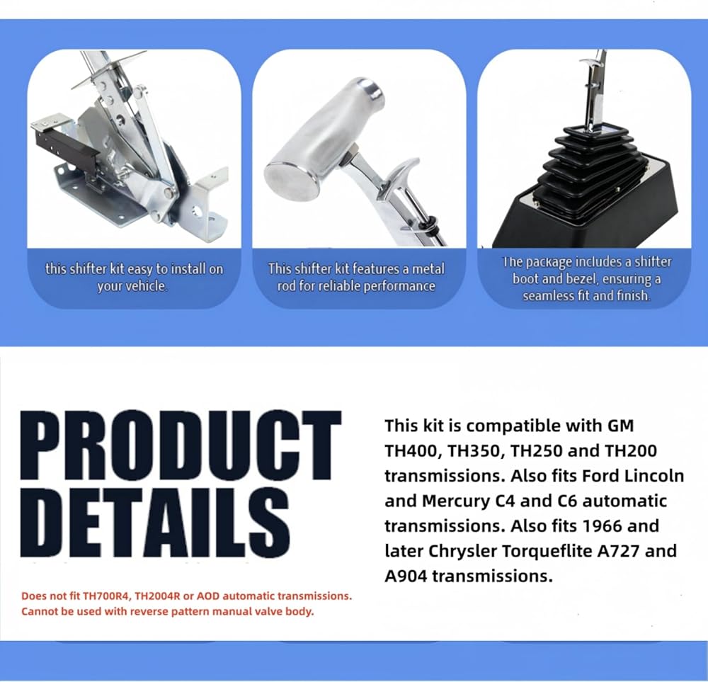 الإعداد للمركبات الكلاسيكية: مصمم خصيصًا ليناسب ناقل الحركة الأوتوماتيكي GM TH400، TH350، TH250، وTH200. متوافق أيضًا مع Ford C4 وC6، ومتوافق مع Chrysler Torqueflite A727 وA904 (1966 وما بعده). ملحوظة: لا يناسب أجهزة الإرسال TH700R4 أو TH2004R أو AOD.