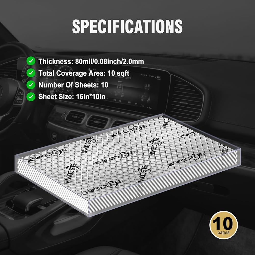 ملاءمة عالمية لجميع المركبات - من السيارات إلى الشاحنات: استمتع بالتحكم في الضوضاء بدرجة احترافية بغض النظر عن السيارة التي تقودها! إنها تناسب الأبعاد الدقيقة لأي مركبة - سواء كانت سيارة صغيرة، أو سيارة دفع رباعي، أو شاحنة متينة، أو شاحنة صغيرة. 36 قدم مربع يغطي معظم المركبات. سُمك 80 مل يعمل على تحسين الوزن/تقليل الضوضاء. سطح مقاوم للاهتراء يدوم لسنوات. لن تقشر. قم بترقية راحة رحلتك اليوم باستخدام مواد فاخرة لعزل صوت السيارة.