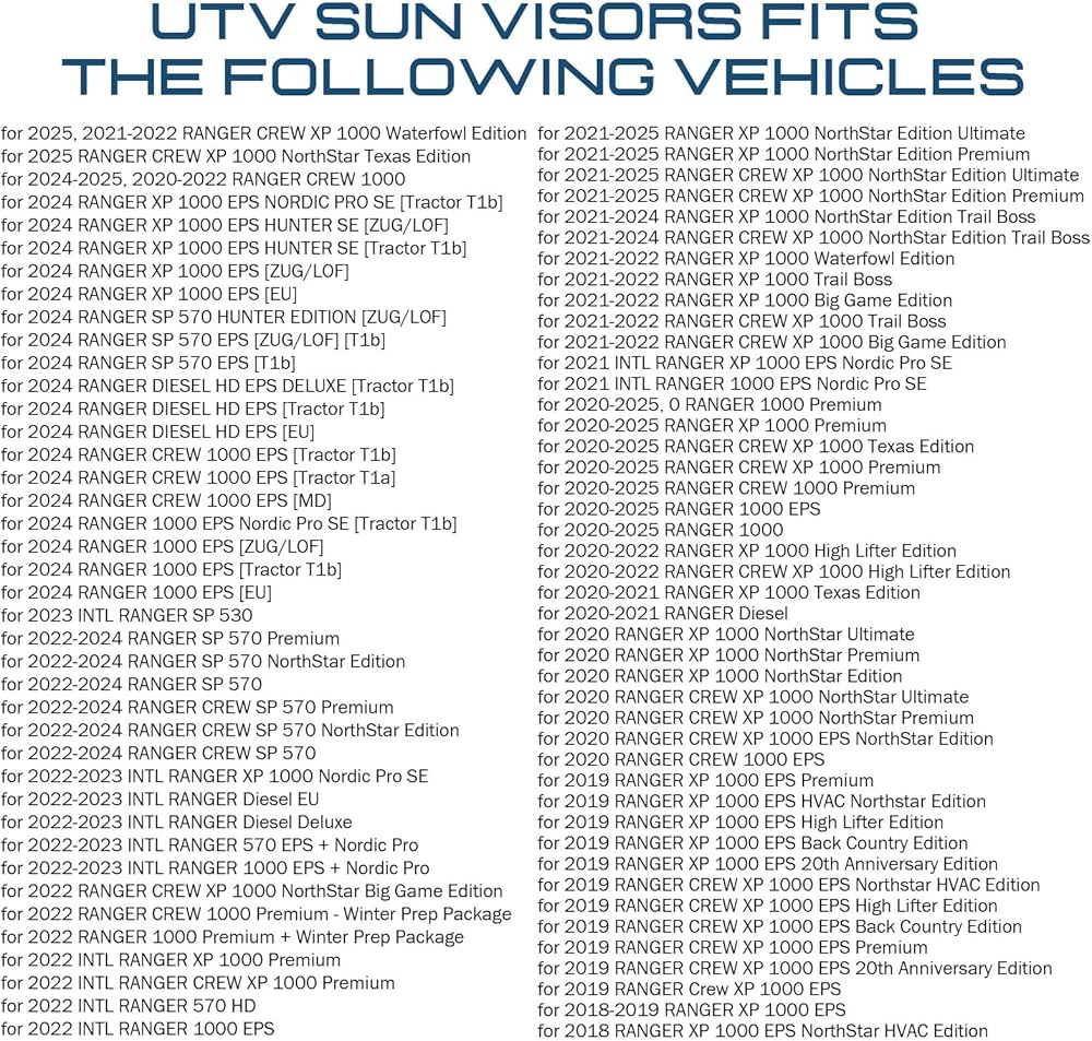 حماية ممتازة من الأشعة فوق البنفسجية ومتانة | أقنعة UTV Sun Visors لـ Polaris مصنوعة من مادة PP عالية الجودة، وتحجب 99% من الأشعة فوق البنفسجية الضارة بينما تقاوم التآكل والتمزق اليومي؛ يقاوم البناء القوي الاعوجاج أو التشقق في درجات الحرارة القصوى (-30 درجة فهرنهايت إلى 180 درجة فهرنهايت)، مما يوفر حماية موثوقة من أشعة الشمس في جميع الفصول.
