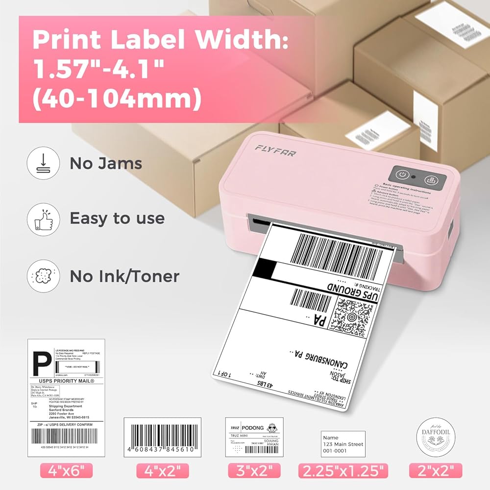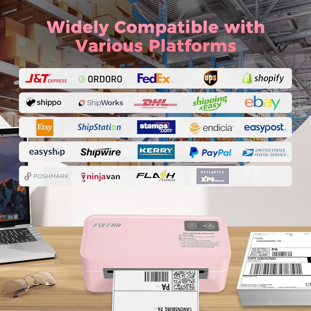 توافق واسع مع منصات التجارة الإلكترونية: تُستخدم طابعة ملصقات الشحن FLYFAR 4x6 على نطاق واسع لطباعة الملصقات لمنصات مختلفة، مثل Amazon، وEbay، وShopify، وUSPS، وUPS، وEtsy، وPayPal، وPoshmark، وFedEx، وما إلى ذلك. إنها مناسبة جدًا لشركتك الصغيرة عبر الإنترنت لشحن الطرود (احفظ ملصقات الشحن الخاصة بك بصيغة PDF وقم بتحميلها إلى تطبيق "Label Expert" للطباعة)