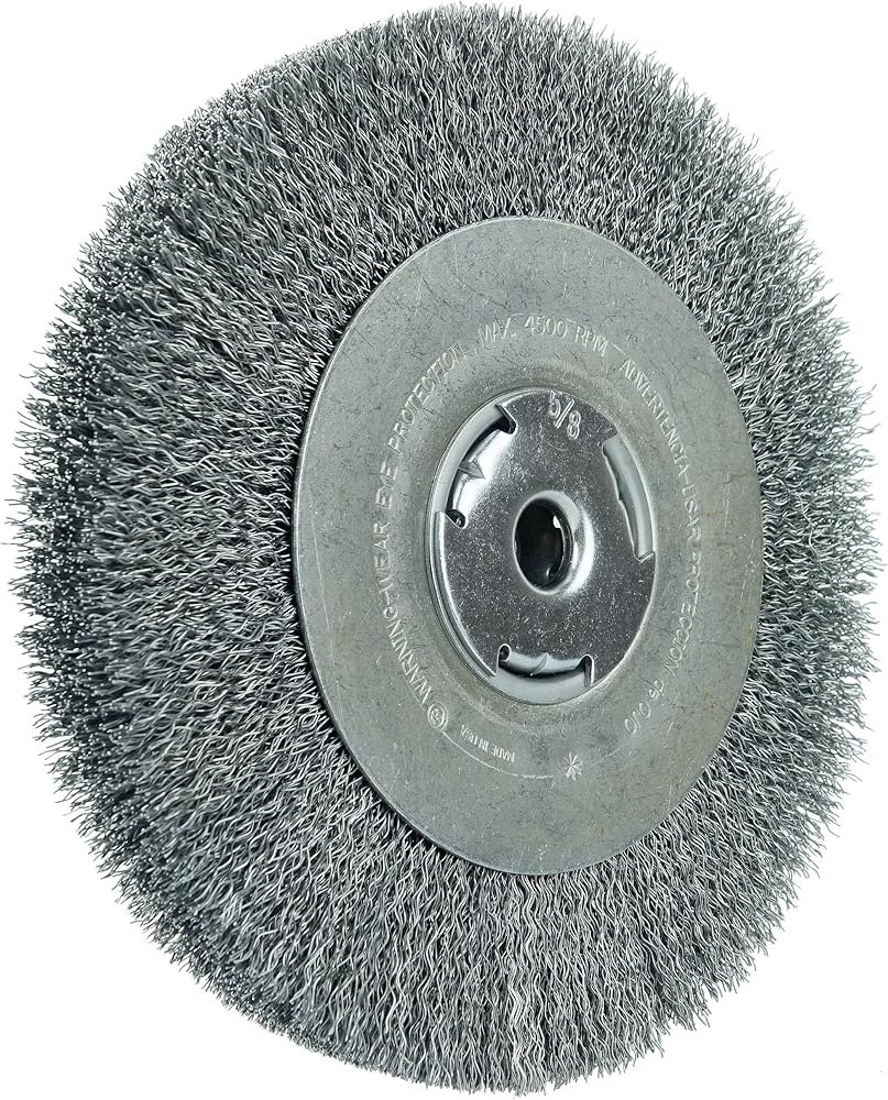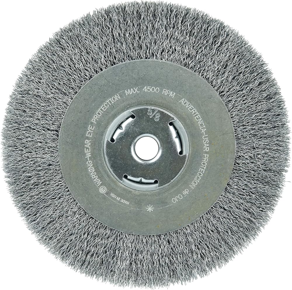 Wolverine 6" Wide Face Crimped Wire Wheel Brush provides a flexible brushing action and cost-effective performance in general purpose cleaning and deburring applications. Featuring Weiler's solid ring construction, these radial brushes are available in heat-treated steel, type 302 stainless steel and brass wire for use in a wide variety of applications. 5/8" arbor hole for use on bench/pedestal grinders.