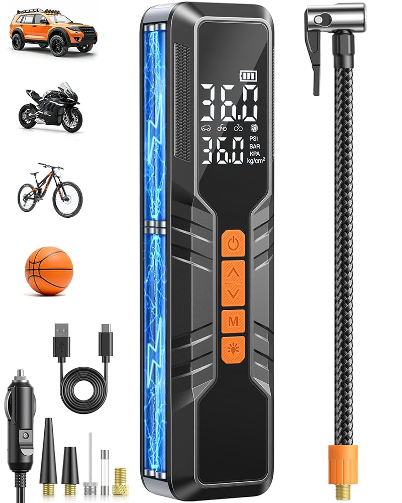 • أداة استخدام متعددة الاستخدامات: مضخة نفخ الإطارات تأتي مع أربعة أنواع من فوهات الهواء وخرطوم هواء من النايلون. الصمام الأمريكي القياسي مناسب للسيارات وسيارات الدفع الرباعي والدراجات النارية وإطارات الدراجات، ومحول الإبرة مثالي لنفخ المعدات الرياضية مثل كرات السلة، والمحول العام يعمل بشكل جيد مع حلقات السباحة والوسائد والوسائد الهوائية والمزيد. تم تجهيز ضاغط الهواء بمنافذ إدخال/إخراج USB-C وUSB، مما يوفر طاقة احتياطية لهواتفك والأجهزة الإلكترونية الأخرى.