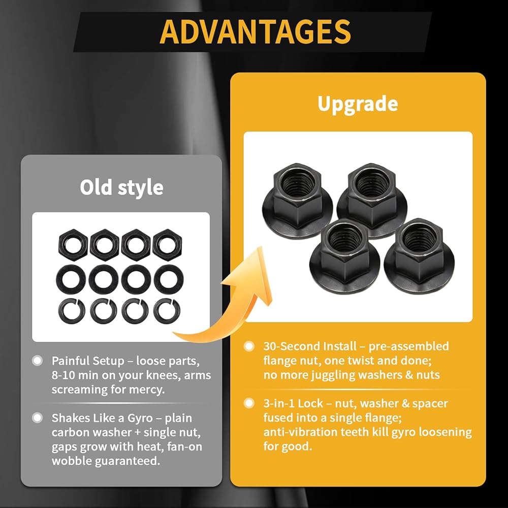 • تصميم خالٍ من التمدد: صواميل شفة سميكة وخيوط أطول، يتم تحميل الخيوط الملفوفة بدقة خلال دورات حرارة لا حصر لها. يتمتع بشكل أفضل بالمسامير والصواميل دون الحاجة إلى إعادة عزم الدوران بين السباقات
