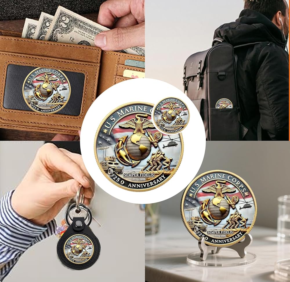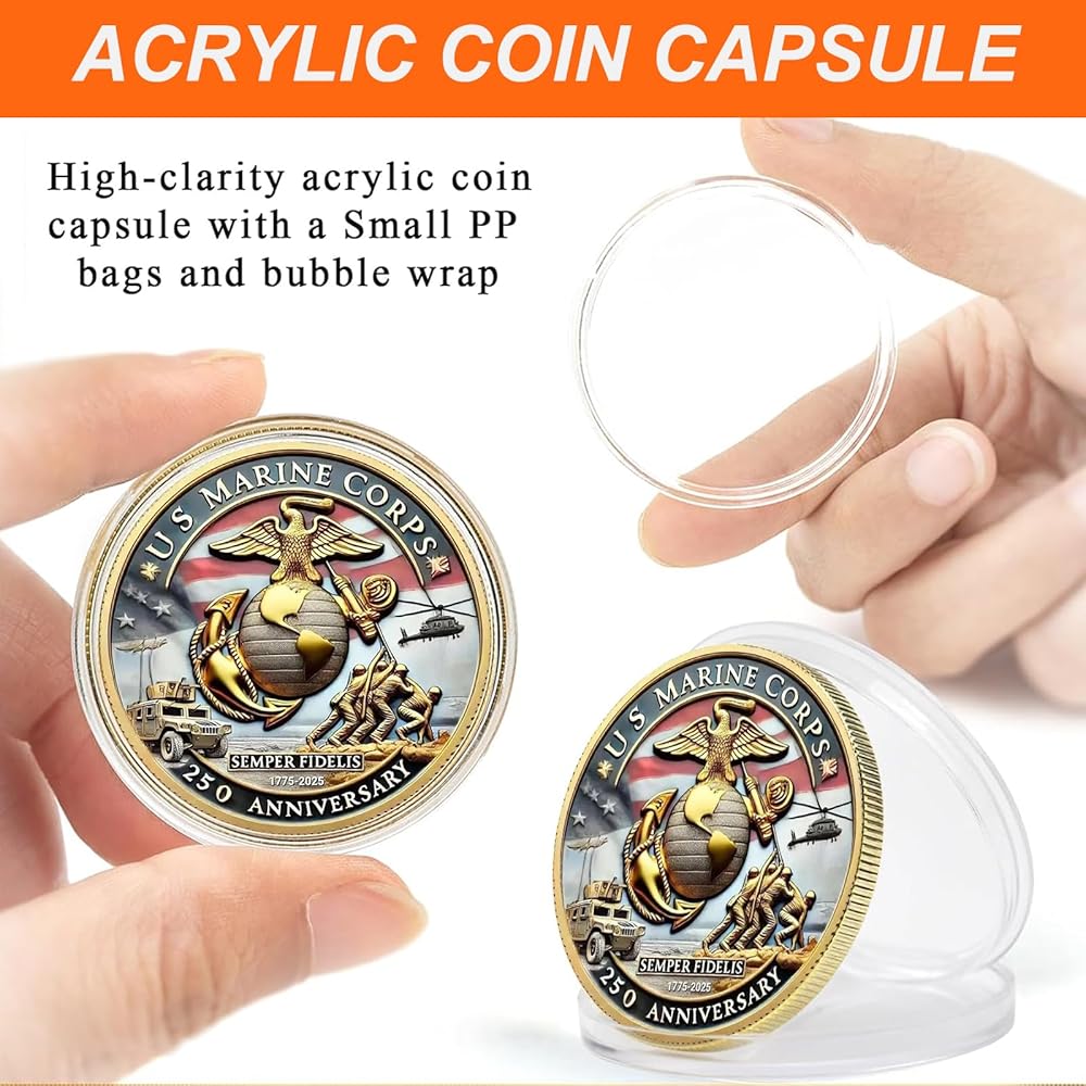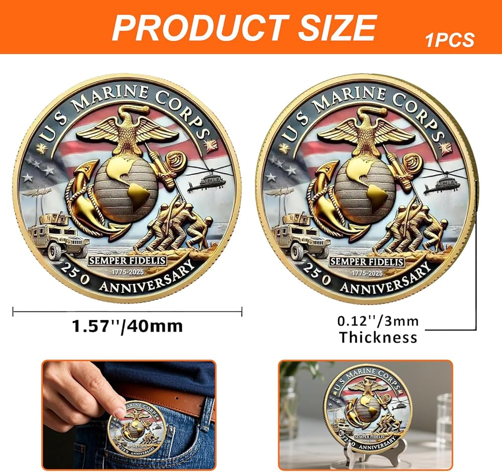 Celebrate 250 years of courage, discipline, and sacrifice with this premium USMC 250th Anniversary Challenge Coin. Designed for true patriots and crafted with precision, this double-sided Marine Corps coin honors the brave men and women who have served in the United States Marine Corps. Each coin features high-relief engraved artwork and is made from durable metal to ensure it stands the test of time. With a 1.57-inch (40mm) diameter and 3mm thickness, it feels substantial in hand—perfect for collectors, veterans, and supporters alike. Whether displayed in a coin holder, gifted during a military ceremony, or treasured as a personal memento, this USMC commemorative coin serves as a powerful reminder of duty, honor, and the enduring legacy of the Corps.