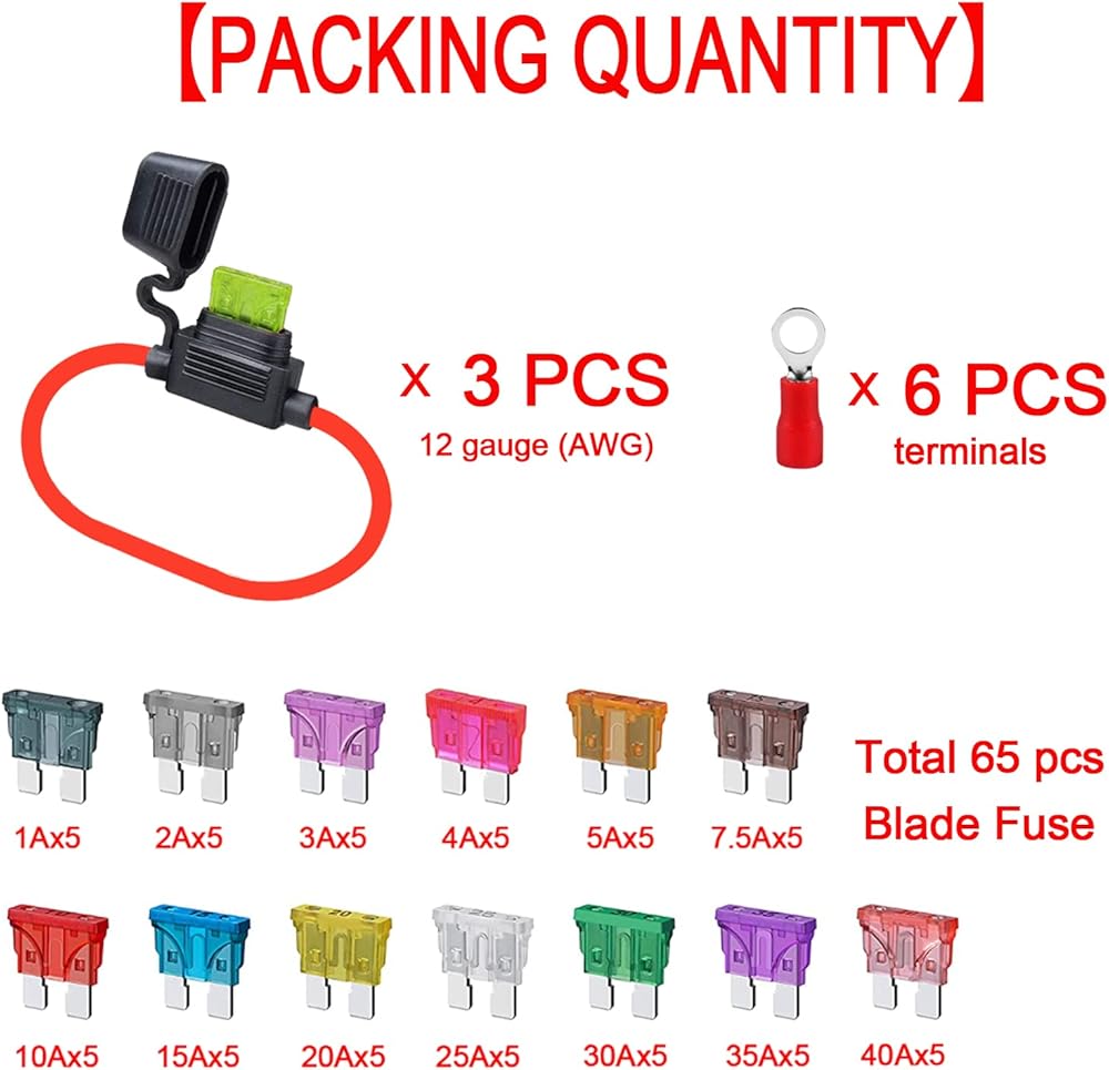 【كمية التعبئة】 3 قطع 12 AWG ATC/ATO حامل فيوز مضمن، 5 قطع من صمامات الشفرة لكل 1A، 2A، 3A، 4A، 5A، 7.5A، 10A، 15A، 20A، 25A، 30A، 35A، 40A، إجمالي 65 قطعة من صمامات الشفرة . 6 قطعة موصلات طرفية.