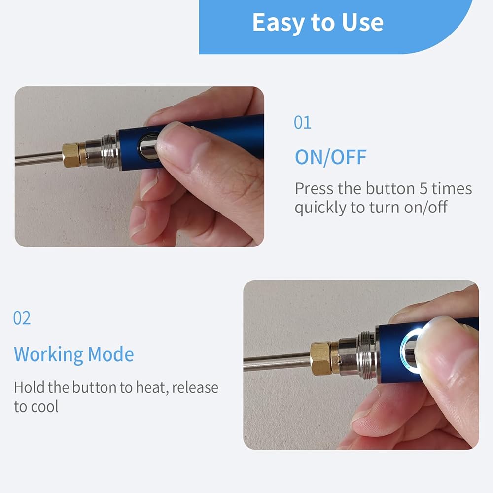 محمول وآمن: مع العبوة الصغيرة والمدمجة (5.6 بوصة × 3.2 × 0.83 بوصة)، فإن الحجم الشبيه بالقلم (6.5 بوصة × 0.55 بوصة) يمكن حمله في الحقيبة أو تخزينه على الرف. بالإضافة إلى ذلك، فإنه سيتم تنشيط وضع السكون التلقائي لمدة 5 دقائق أثناء التسخين المستمر لمنع ارتفاع درجة الحرارة وذلك لإطالة عمر المكونات وضمان التشغيل الآمن.