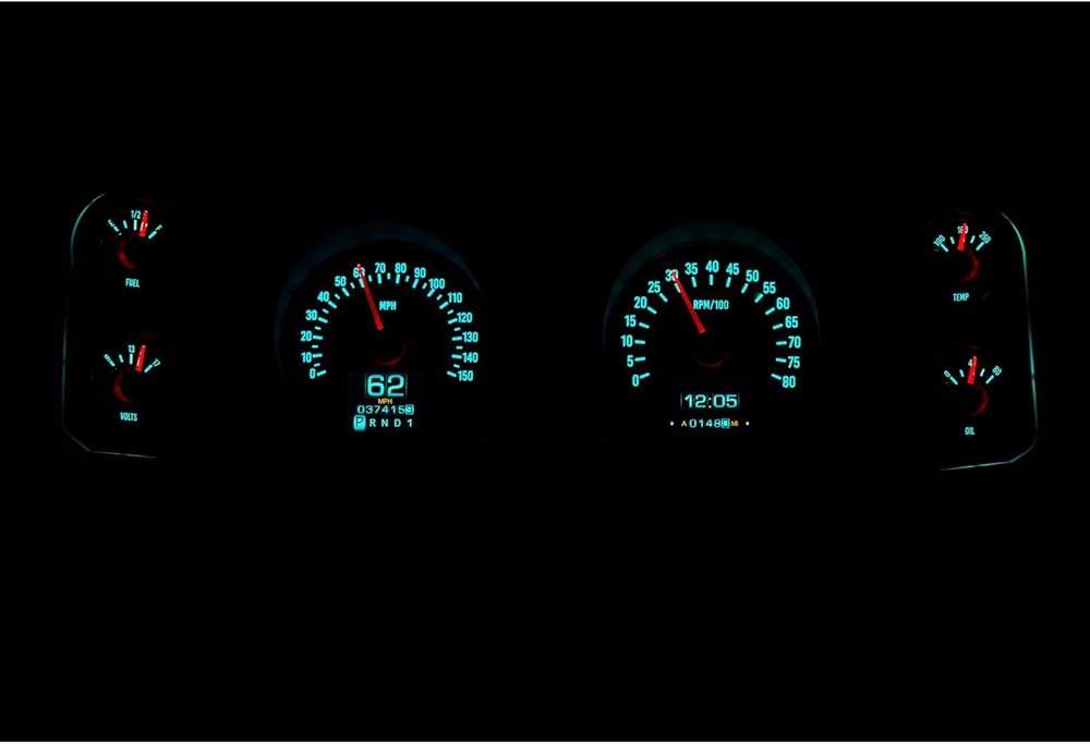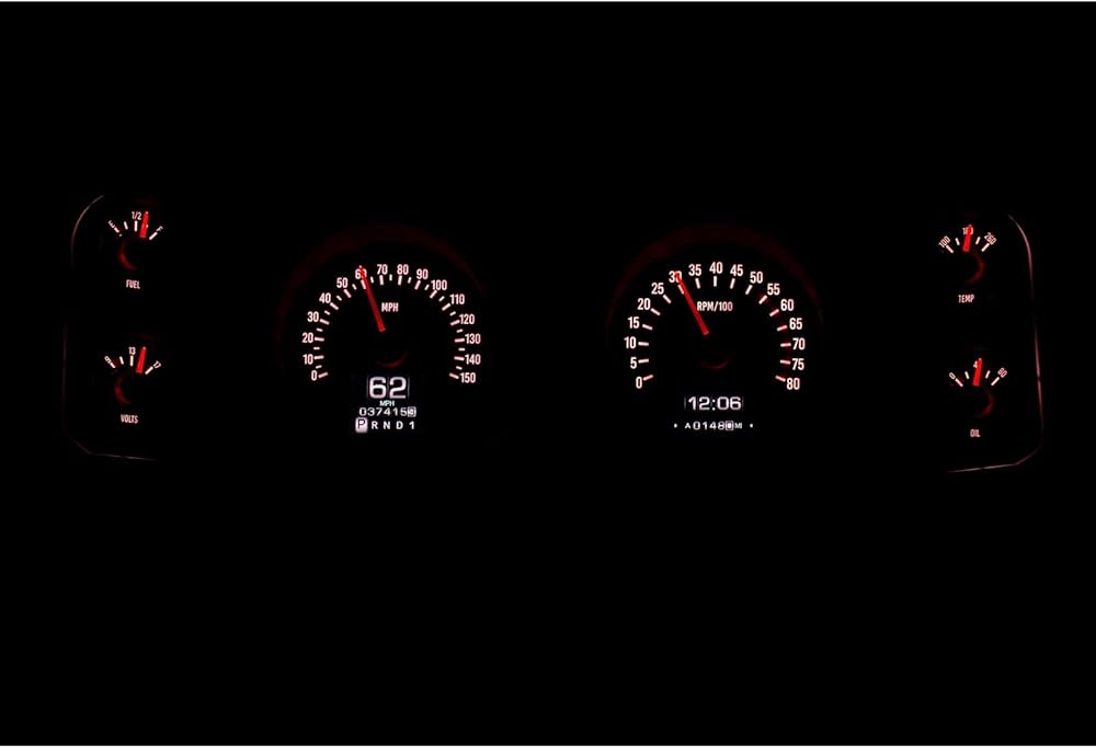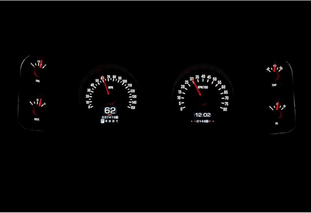 Analog Gauges: Speedometer (0-150MPH), Tachometer (0-8000rpm), Oil Pressure (0-80psi), Water Temp, Fuel Level, and Voltmeter