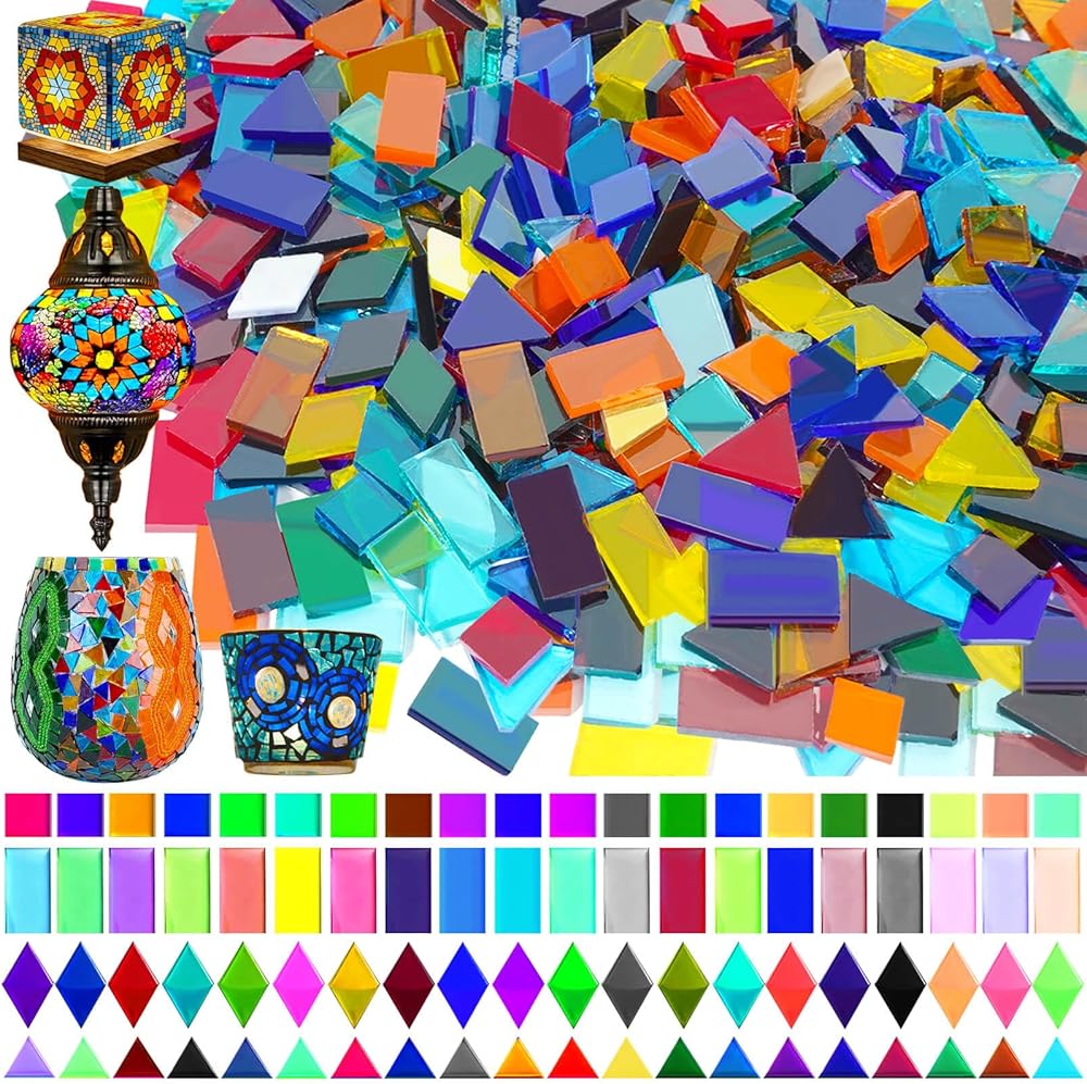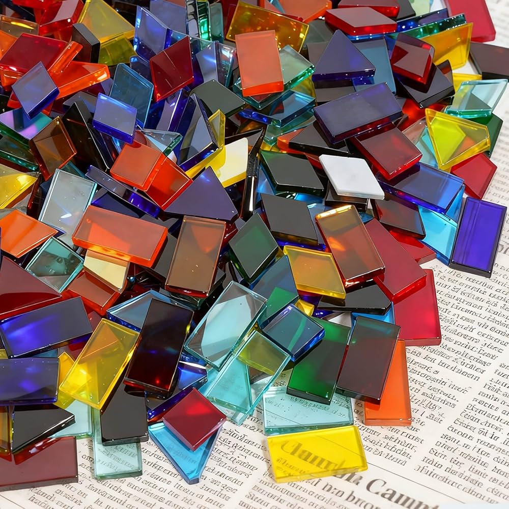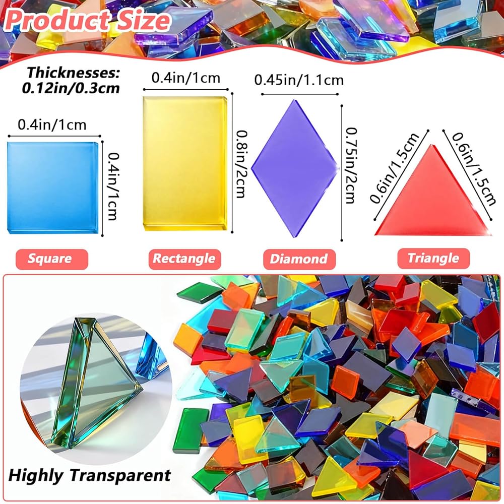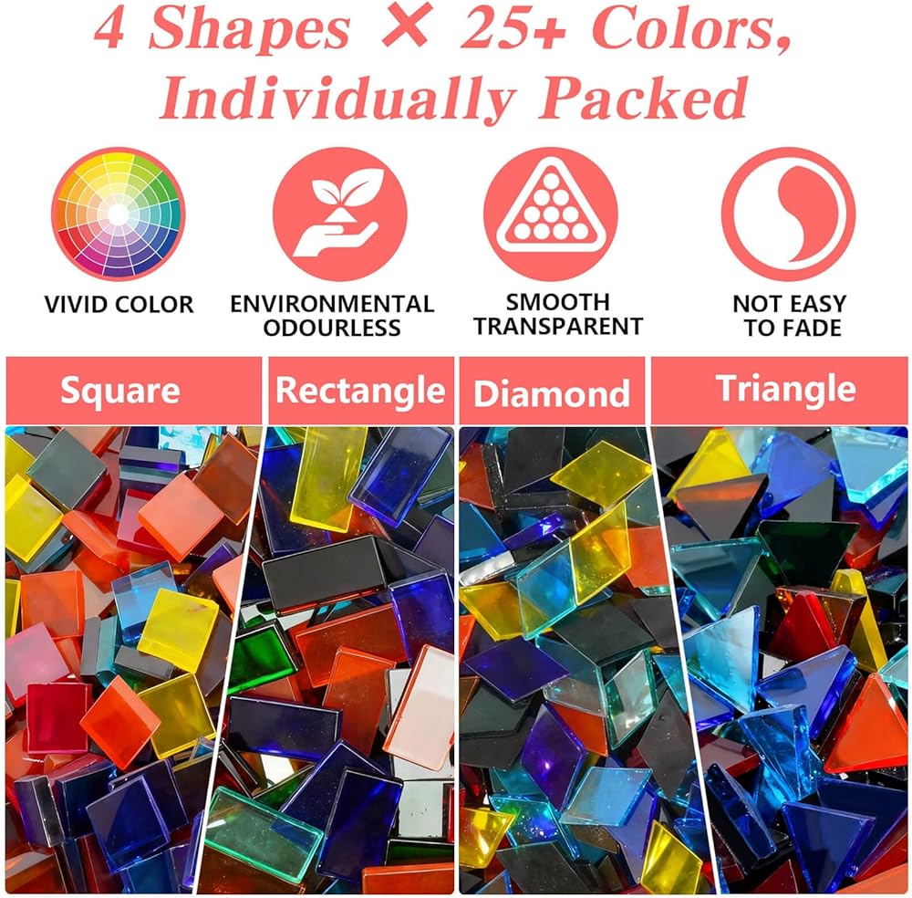 - حزمة قيمة: تتضمن 2800 بلاط فسيفساء زجاجي ملون مقطوع مسبقًا في 4 أشكال - مربع (~1100 قطعة)، ماسي (~800 قطعة)، مستطيل (~400 قطعة)، مثلث (~500 قطعة).