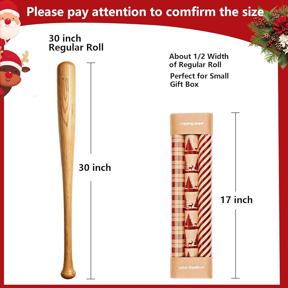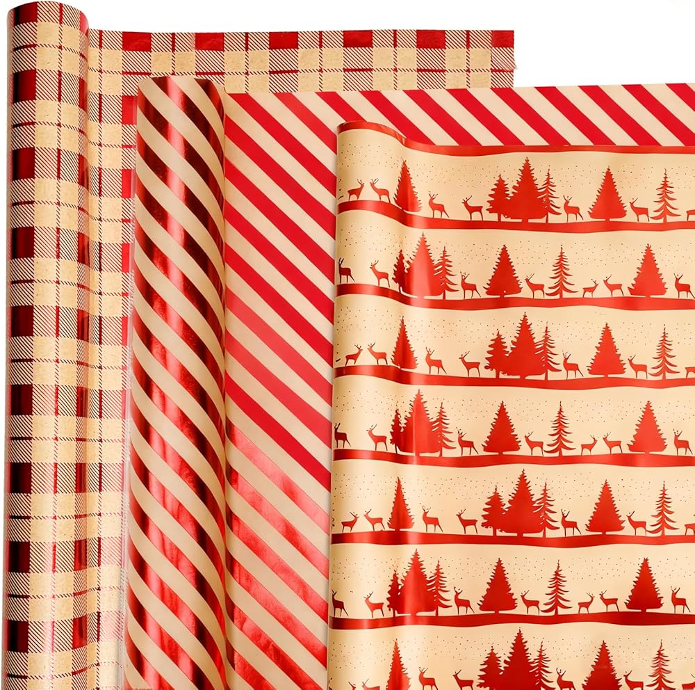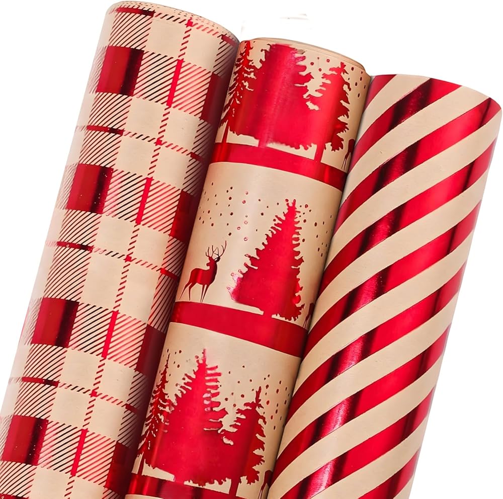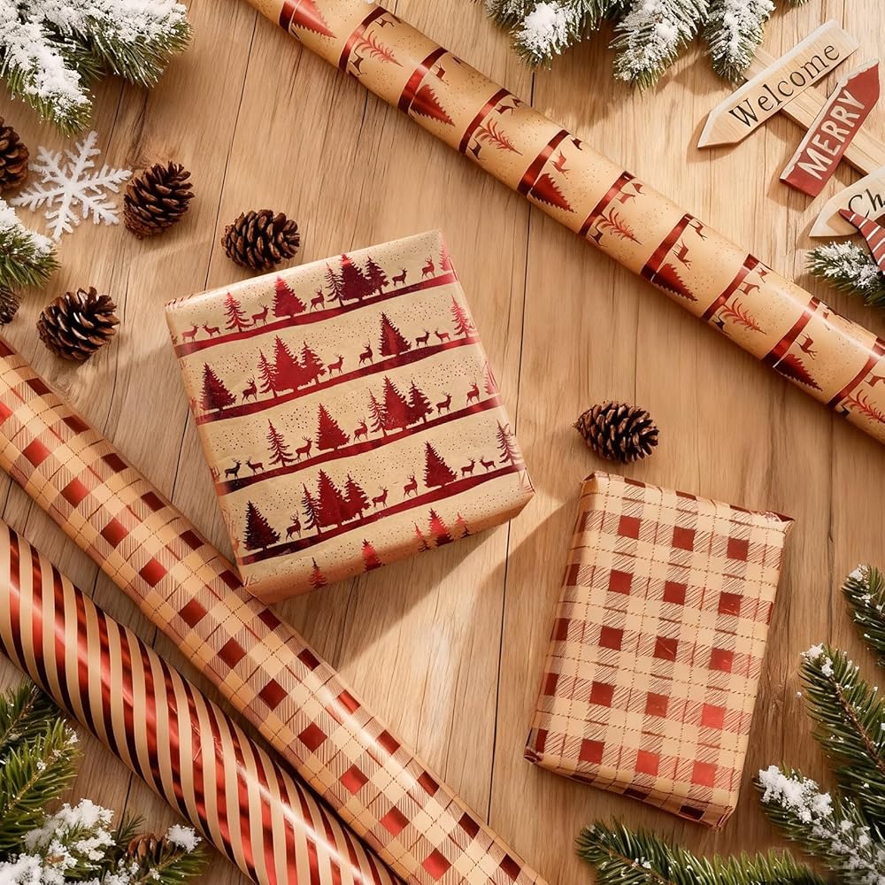 [تصميم عيد الميلاد] لفات ورق تغليف عيد الميلاد تتضمن 3 تصميمات من ورق الكرافت، وشجرة عيد الميلاد الحمراء والرنة، ومنقوشة حمراء، وخطوط حمراء وتصميمات أخرى لإضافة جو احتفالي إلى أي هدية.